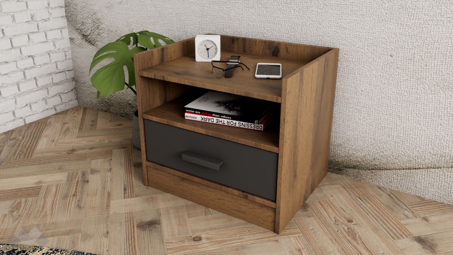 Благодарение на практичният нощен шкаф Димана ще имаш място за всички най-необходими вещи, които винаги да ти бъдат под ръка. Той ти предлага чекмедже и отворен рафт, като горният плот е разположен по-ниско, за да можеш да използваш и него като рафт. Прекрасна декорация, нощна лампа или любима книга - всичко ще намери място отгоре, за да направи спалнята ти още по-уютно място.
