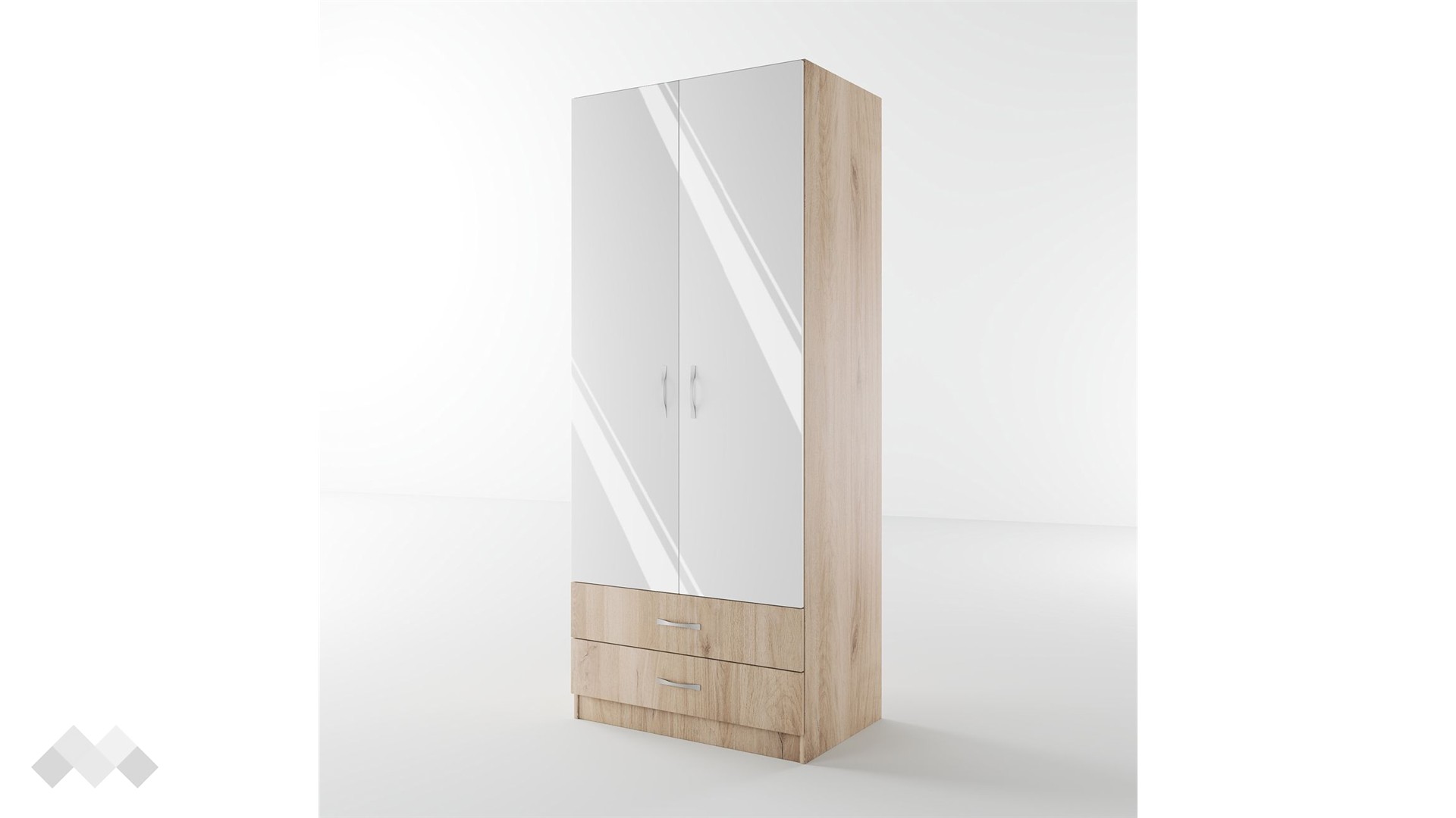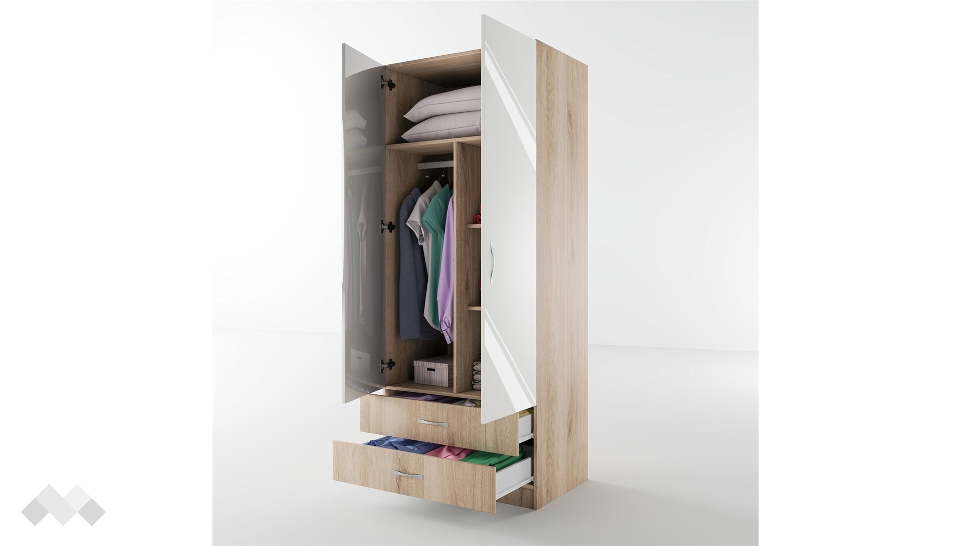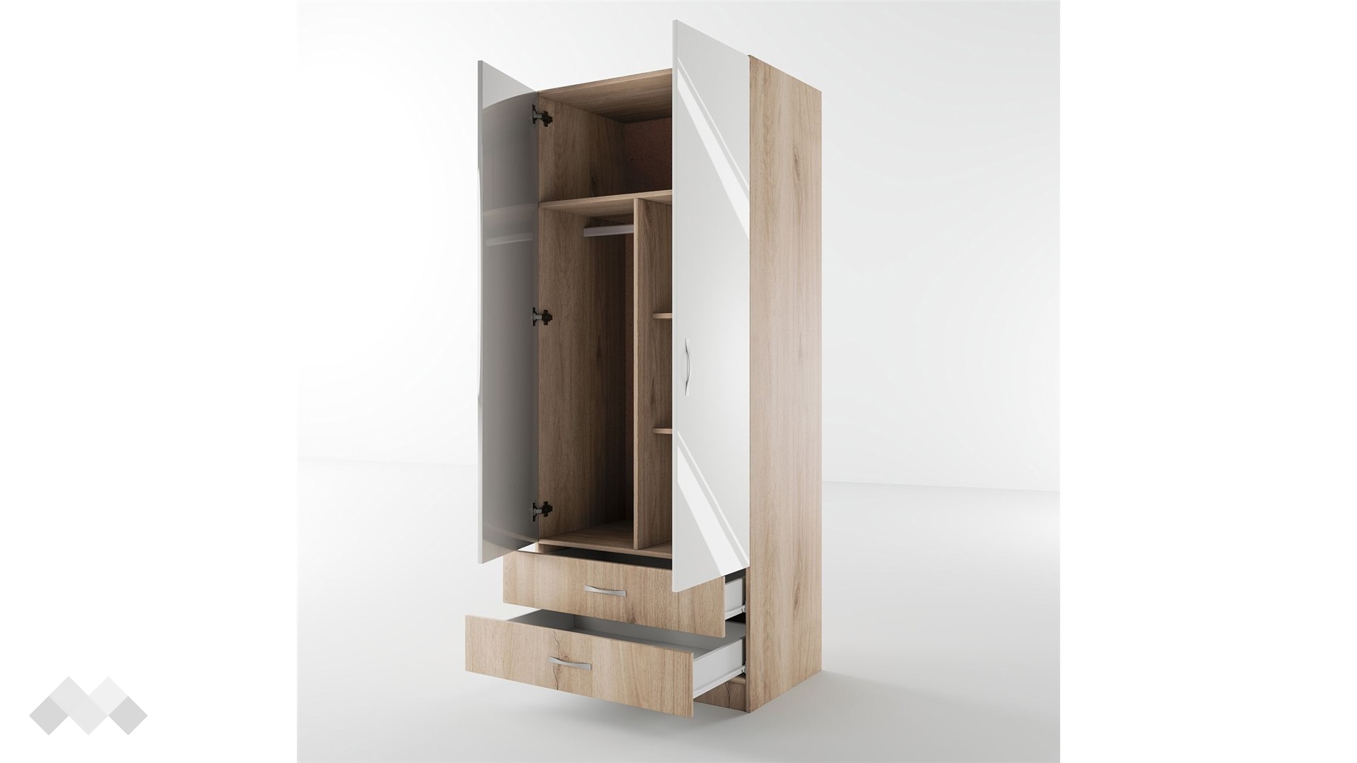 ⭐ Предимства: ✓ двукрилен ✓ 2 чекмеджета ✓ 4 рафта ✓ лост за закачалки ✓ механизъм за плавно затваряне ✓ модерен декор ✓ практично разпределение ✓ качествена изработка ✓ 16 мм ПДЧ