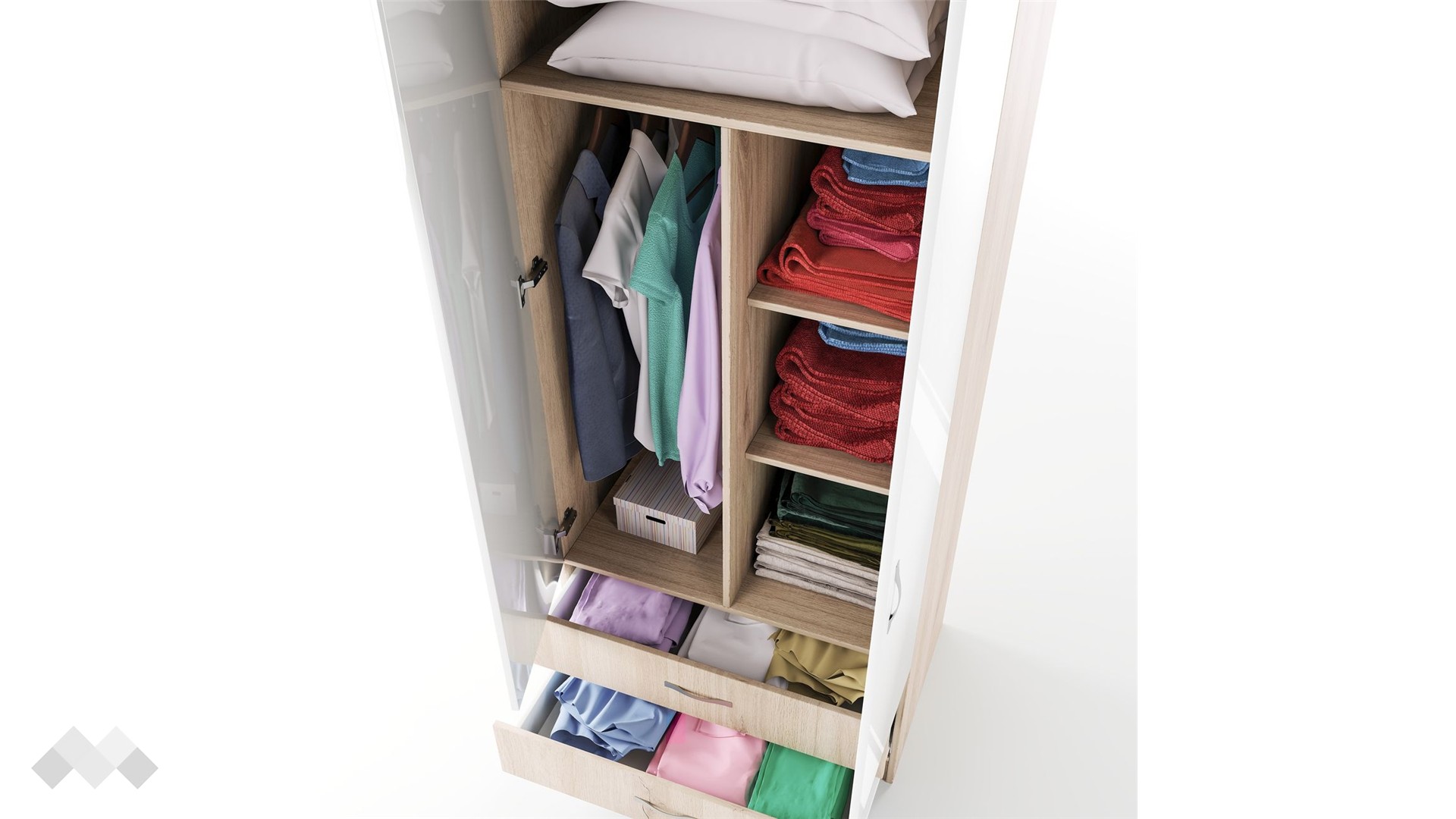 Благодарение на практичното разпределение на вътрешното пространство, с лекота ще можеш да организираш и съхраняваш дрехите си, като същевременно ще имаш бърз достъп до всеки тоалет. В широките две чекмеджета е удобно да съхраняваш бельо, чорапи или други аксесоари. Комбинацията от рафтове и лост за закачалки ти дава възможност да организираш дрехите си по най-удобния за теб начин.