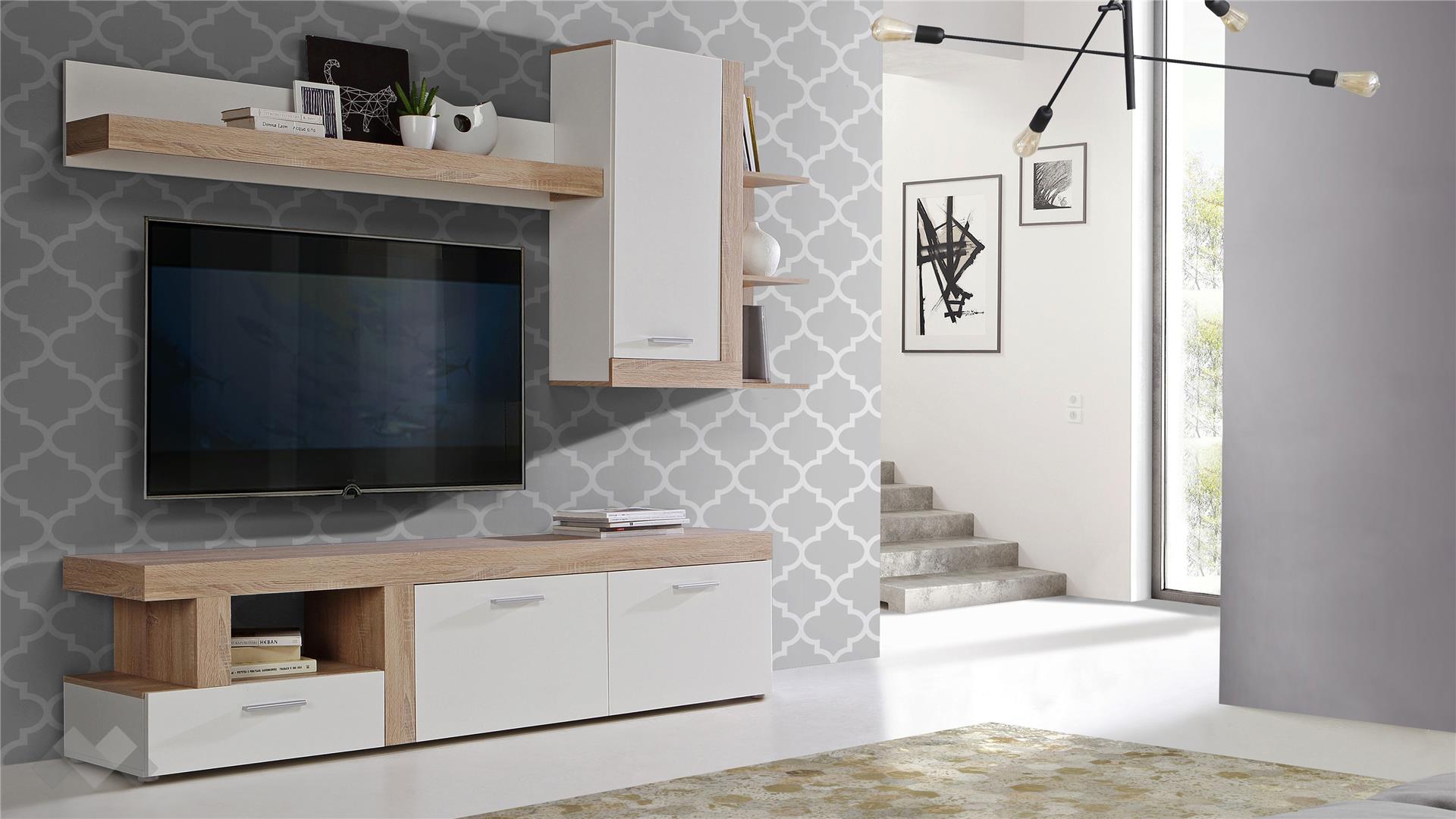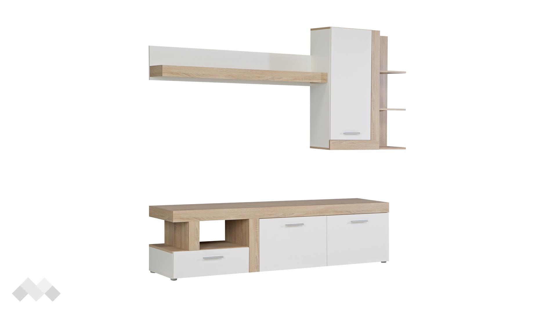 ⭐ Предимства: ✓ компактна и практична ✓ подходяща и за по-малки жилища ✓ ТВ шкаф ✓ окачен шкаф ✓ 2 етажерки ✓ качествена изработка ✓ телескопични водачи ✓ 15 мм ПДЧ