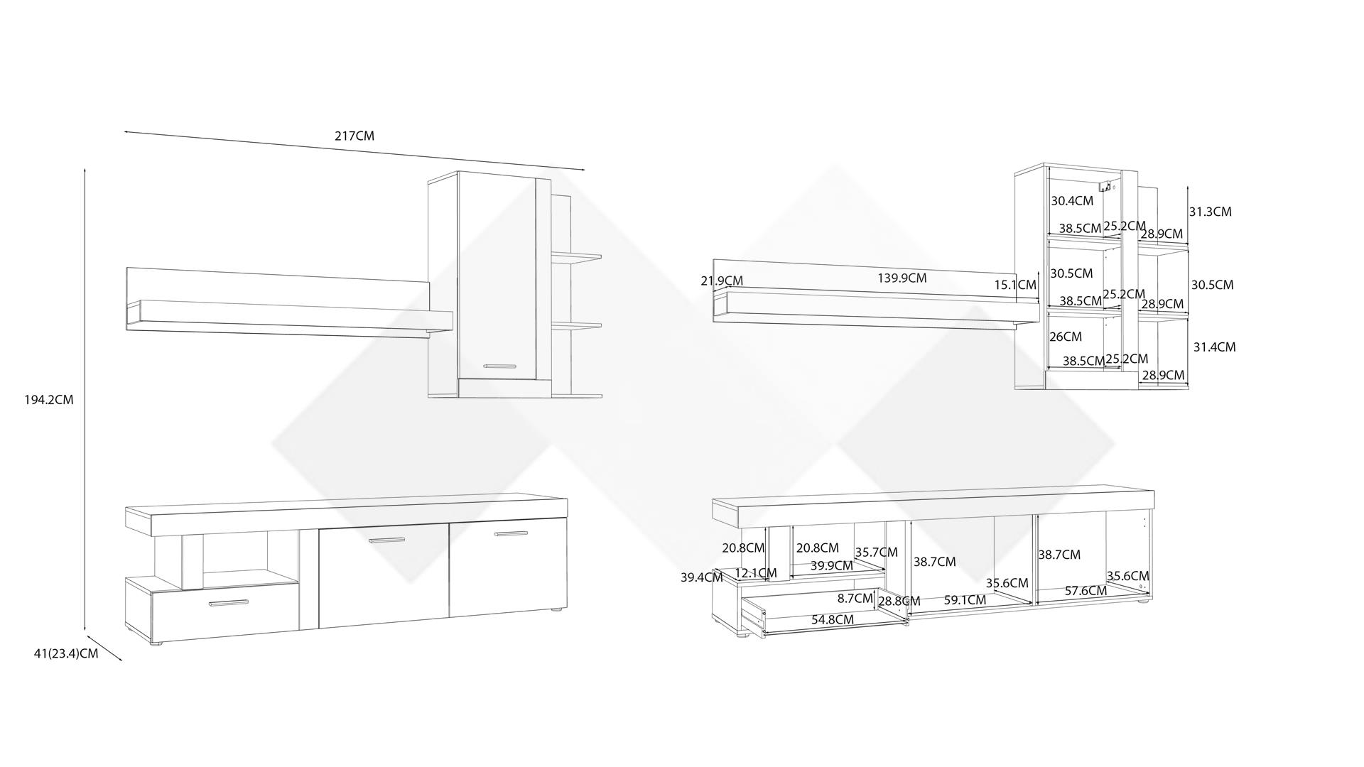 ТВ шкаф: Д: 188 см Ш: 41 см В: 49,9 см