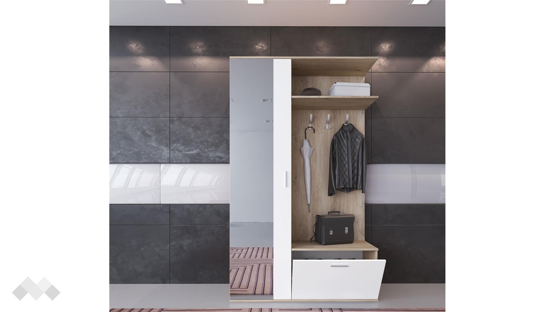 Гардеробът е с изтеглящ се лост и рафт – в него може да прибереш много палта, якета и други връхни дрехи. Огледалото прави стаята по-осветена, а и ти помага да хвърлиш последен поглед на визията си преди излизане. Рафтът над трите закачалки е подходящ за шапки или кутии.