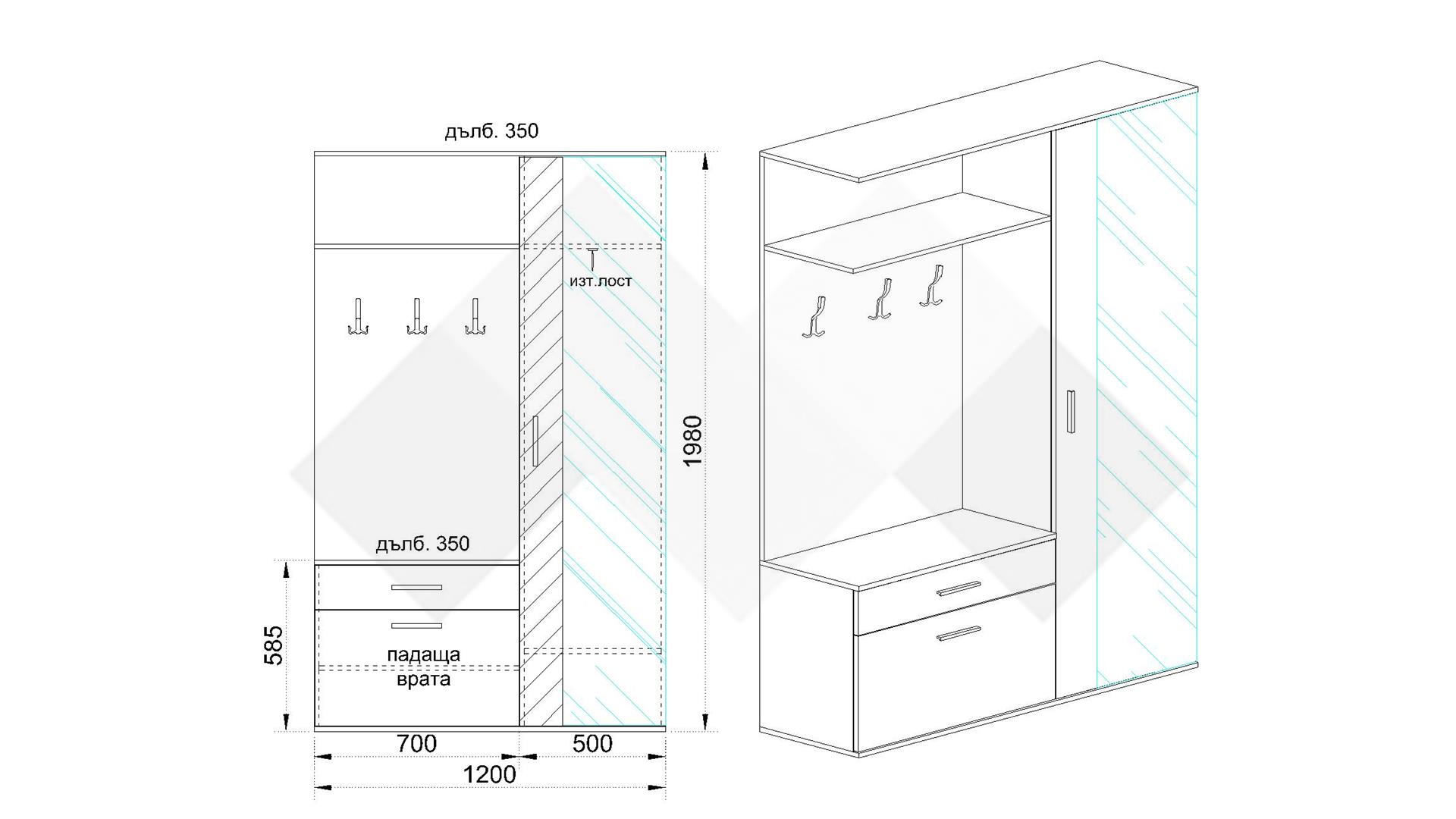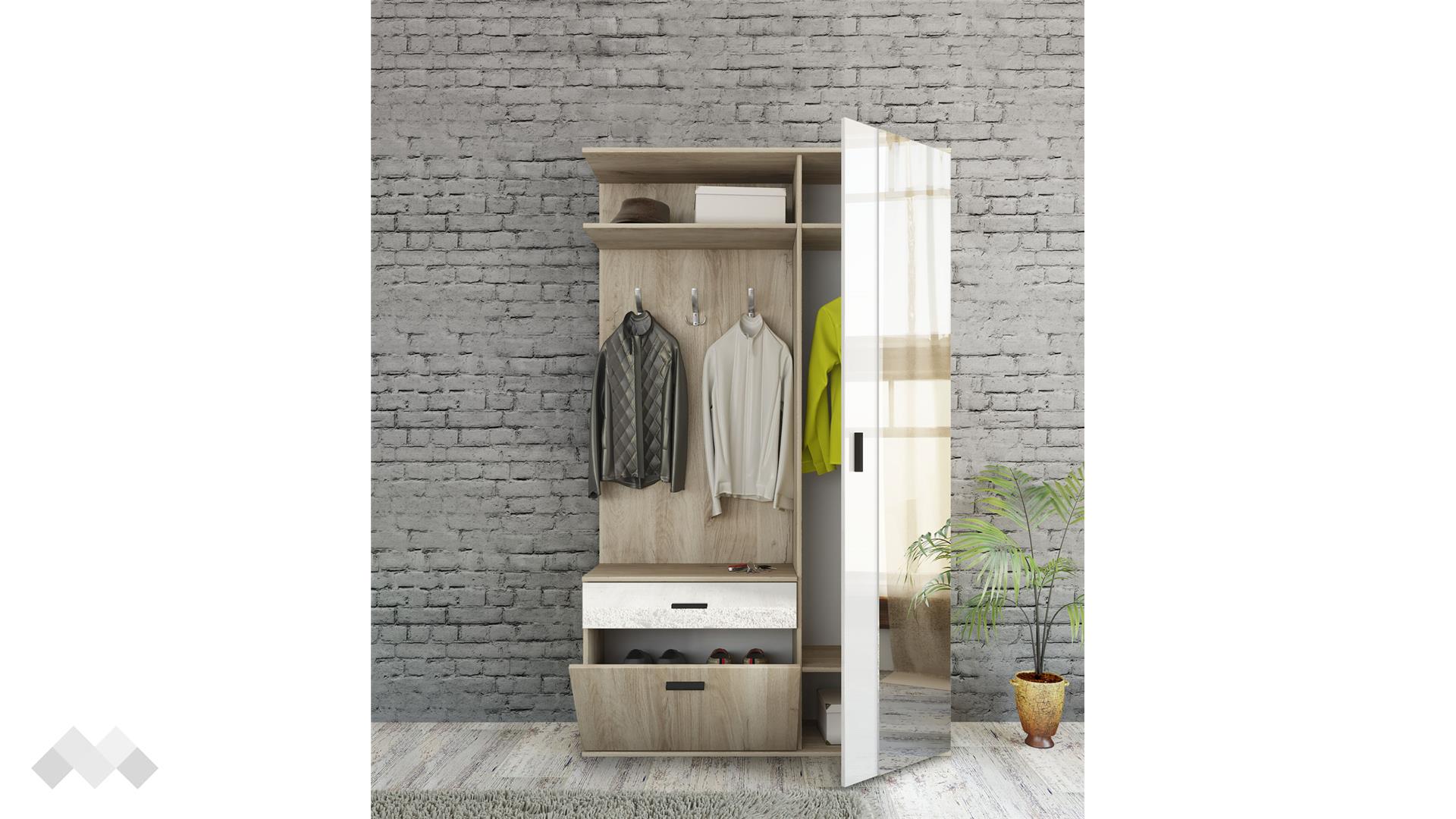Гардеробът е с изтеглящ се лост и рафт – в него може да прибереш много палта, якета и други връхни дрехи. Огледалото прави стаята по-осветена, а и ти помага да хвърлиш последен поглед на визията си преди излизане. Рафтът над трите закачалки е подходящ за шапки или кутии.