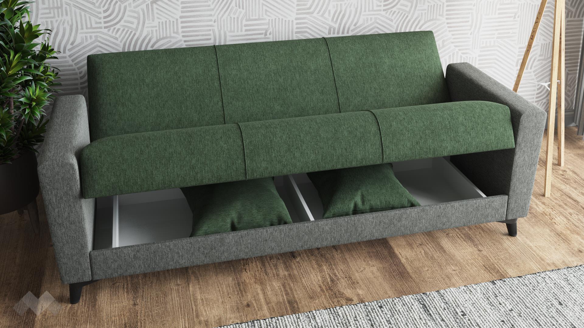 Моделът се разпъва с минимално усилие благодарение на клик-клак механизма, превръщайки се в удобно легло с площ за сън 180/103 см, идеално за гости или ежедневна употреба. Под седалката е разположена просторна ракла, която предлага удобно място за съхранение на завивки, възглавници и други необходими вещи, помагайки да поддържате реда в дома.