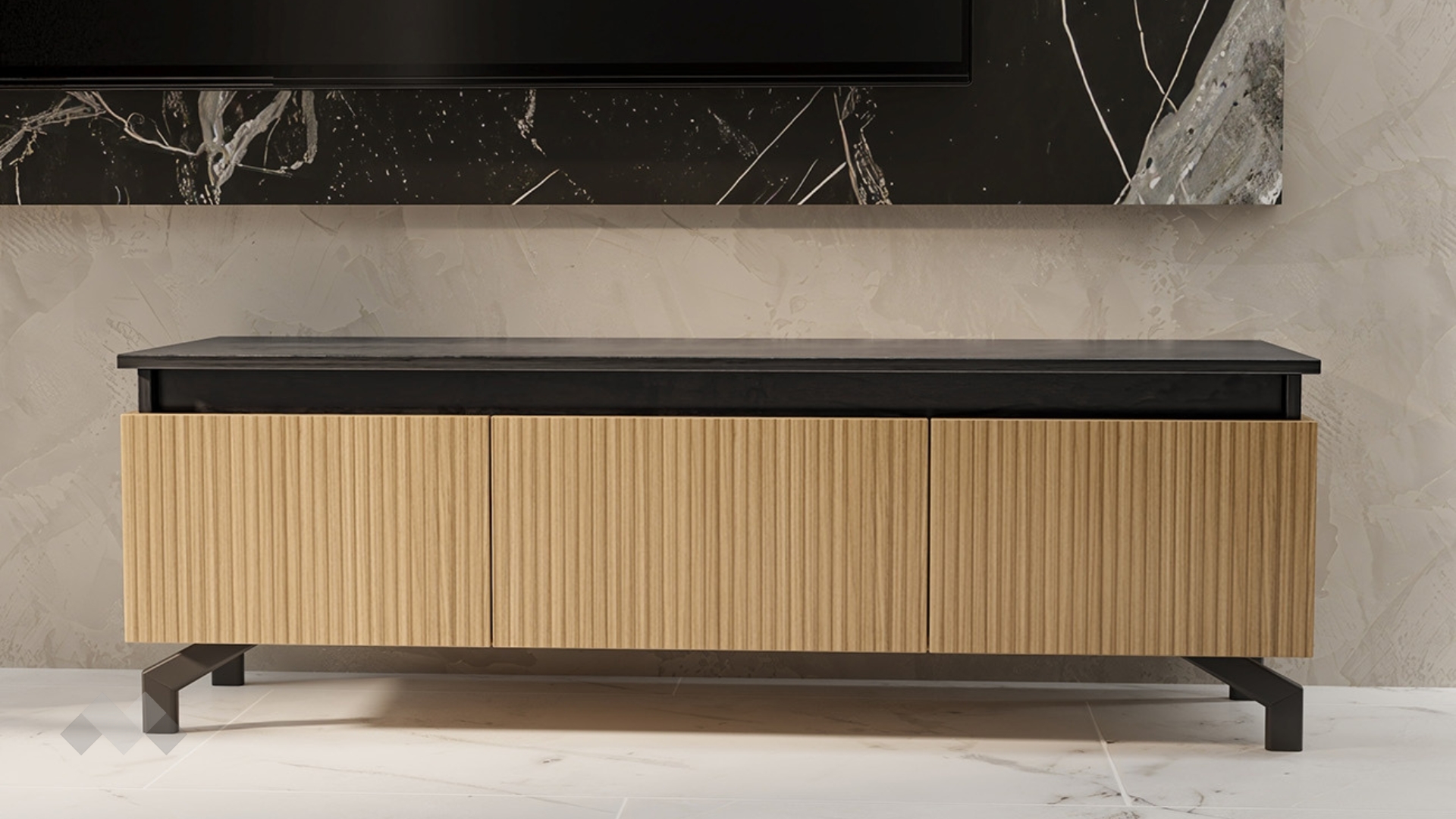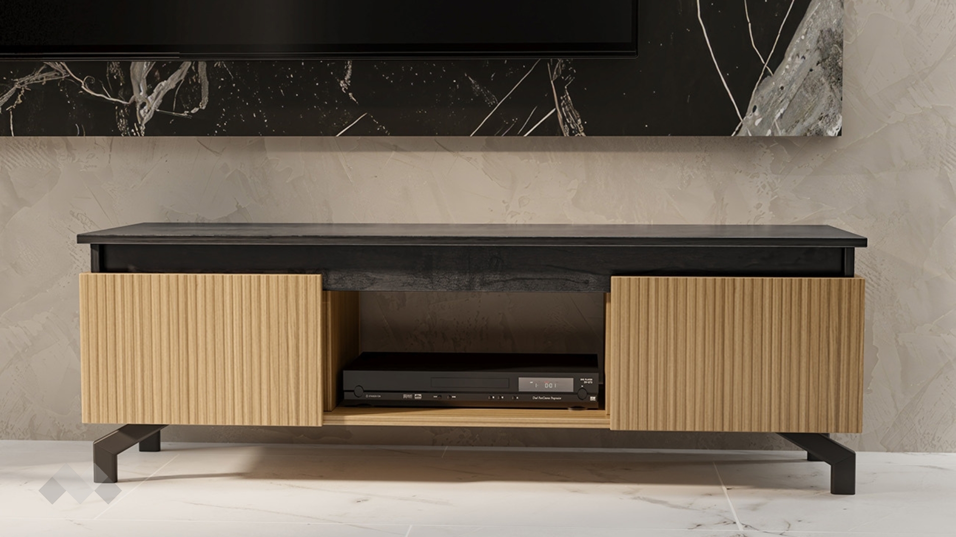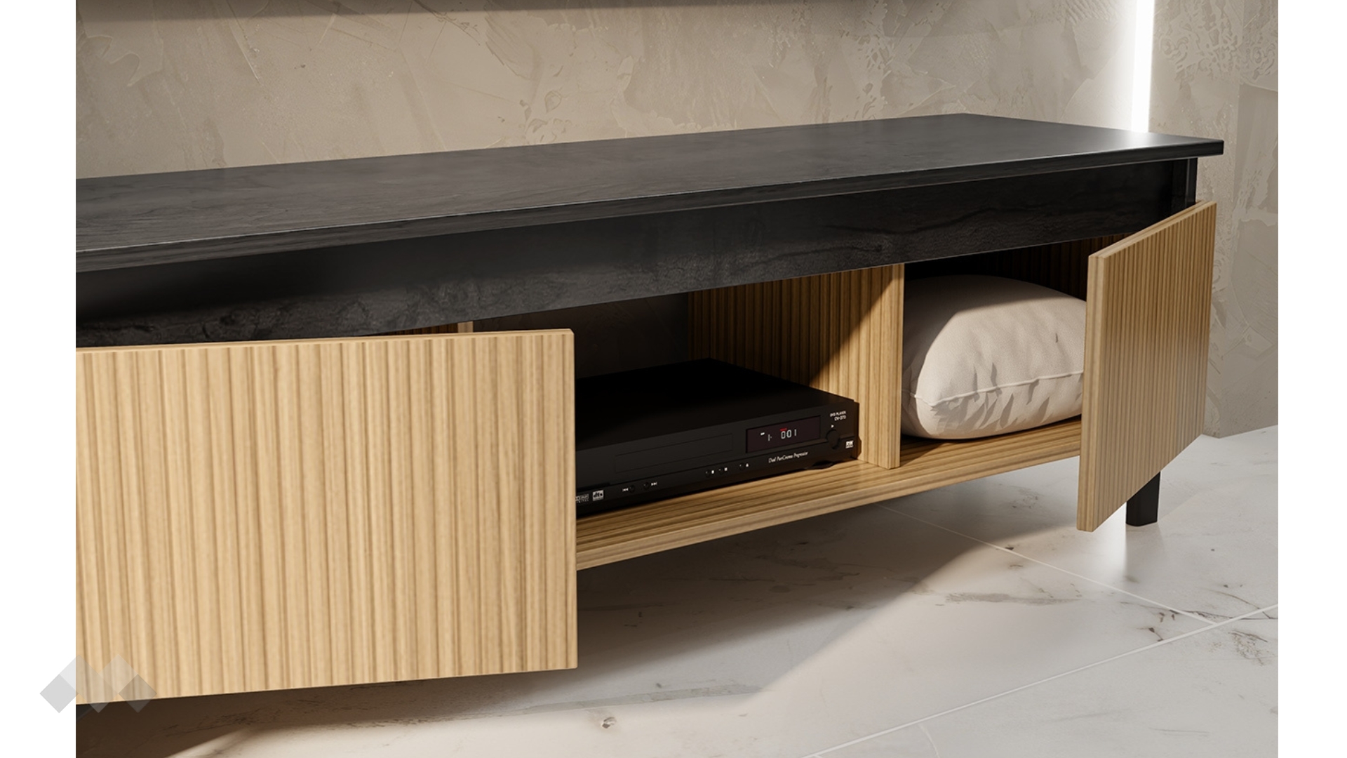 Разполага с два затворени шкафа с врати, които са със странично отваряне и с един затворен шкаф с падаща врата. С трите си просторни затворени шкафа осигурява достатъчно място за съхранение на всичко необходимо – от медийни устройства и дистанционни до книги и аксесоари.