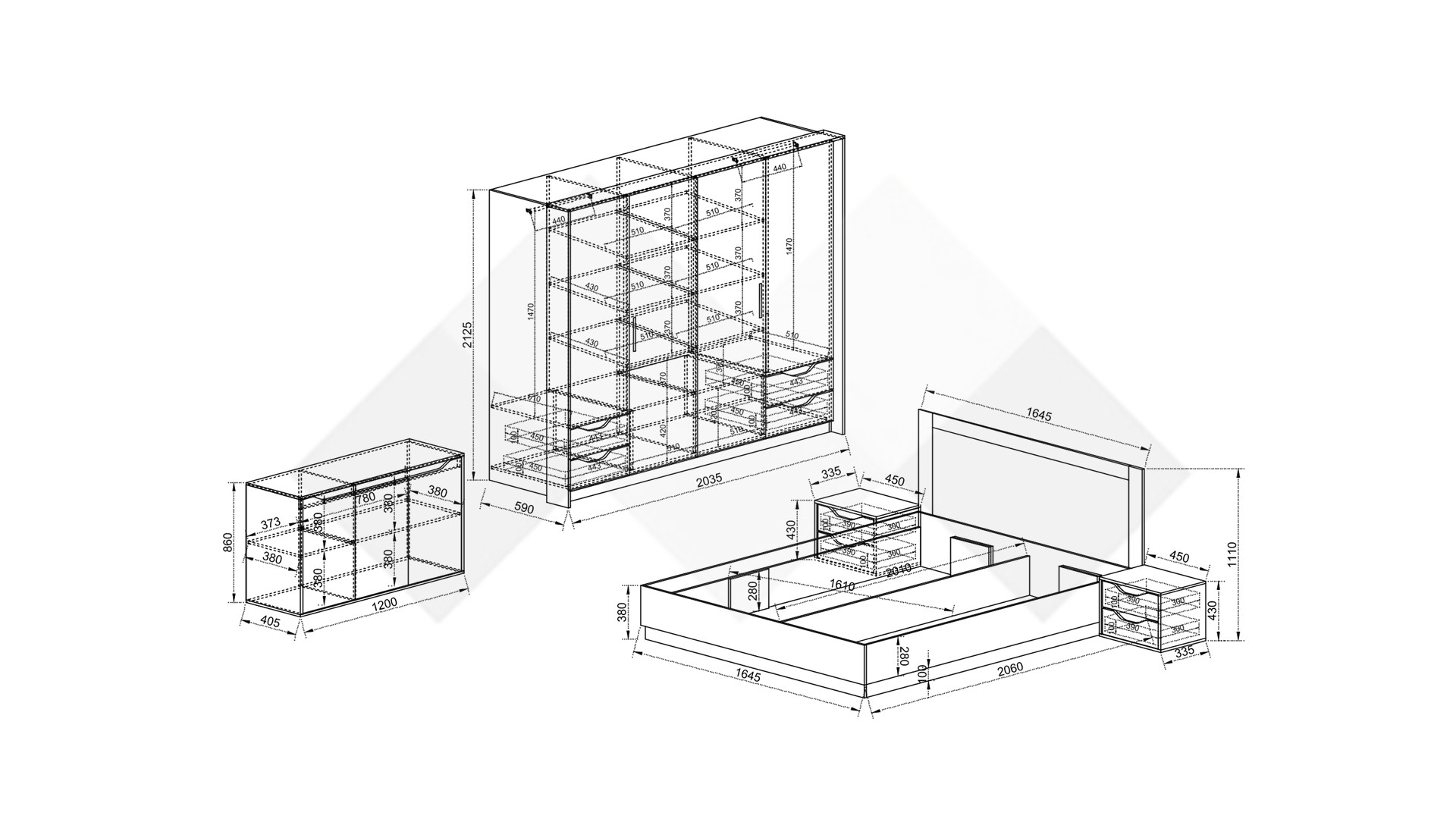 Спалня: Д: 206 см Ш: 164,5 см В: 111 см