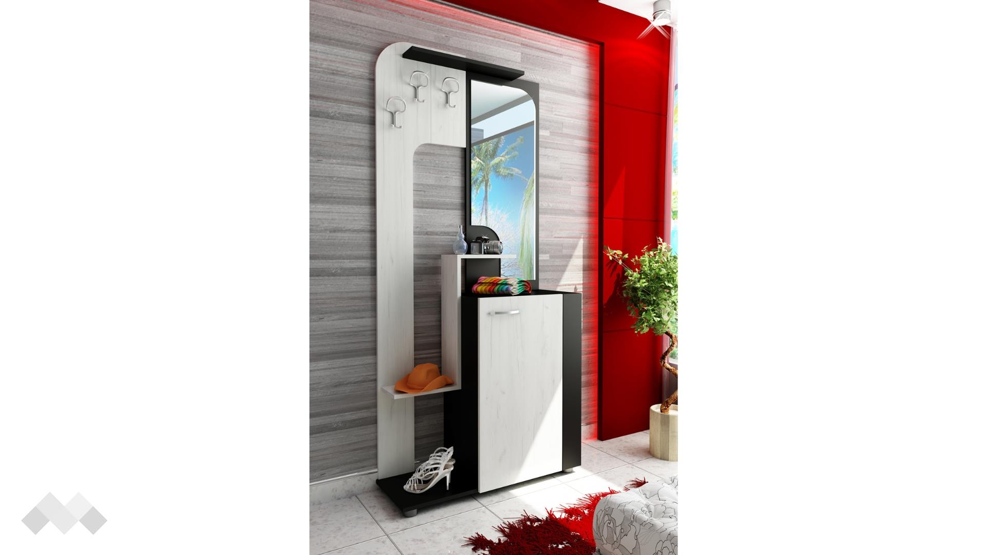 Разполага със широк шкаф, удобен да организираш всичките си обувки, практичната етажерка до него е мястото за всички дребни вещи, които е важно да не забравяш, когато излизаш или пък за украса акцент. Истински ще ти допадне голямото огледало, което ще направи коридора ти по-светъл и ще ти помогне да доизпипаш тоалета си преди излизане. На паното са монтирани три закачалки удобни за якета, палта, шалове или чанти. На рафтчето над тях може да поставиш малки кутии или по-обемни дрехи. В долната част има отворена поставка за обувките, които искаш да са прибрани, но и винаги под ръка в забързаното ежедневие.