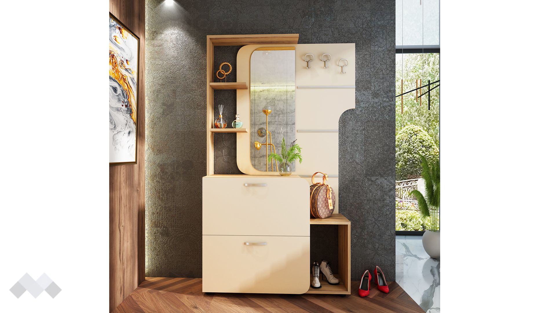 На паното са монтирани три закачалки за якета, палта, шалове или шапки. Дизайнът на закачалките е направен така, че горната им част е с лека извивка. Под тях е разположен отворен шкаф, където може да оставиш любимите обувки, който искаш да са винаги под ръка в забързаното ежедневие. А плотът автоматично се превръща в място за твоите чанти или да поседнеш докато се обуваш.