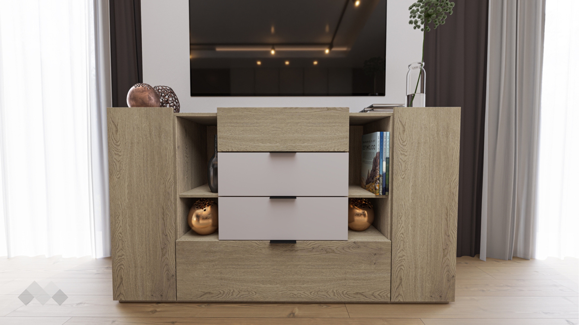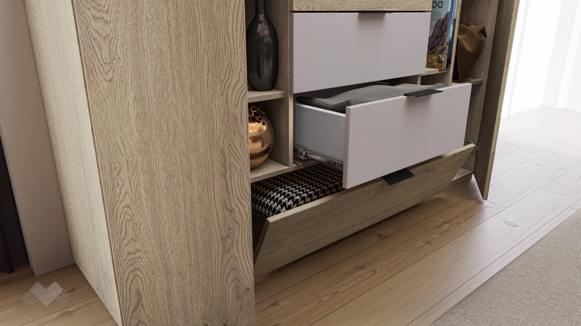 Снабден е с три чекмеджета за подредба на по-дребни вещи и три шкафа, които осигуряват допълнително пространство за принадлежности. Широкият шкаф разположен отдолу е с падаща врата и е удобен за съхраняване на по-обемни вещи. Зад всяка от двете врати със странично отваряне има удобен вътрешен рафт, който помага за оптимална организация на пространството.