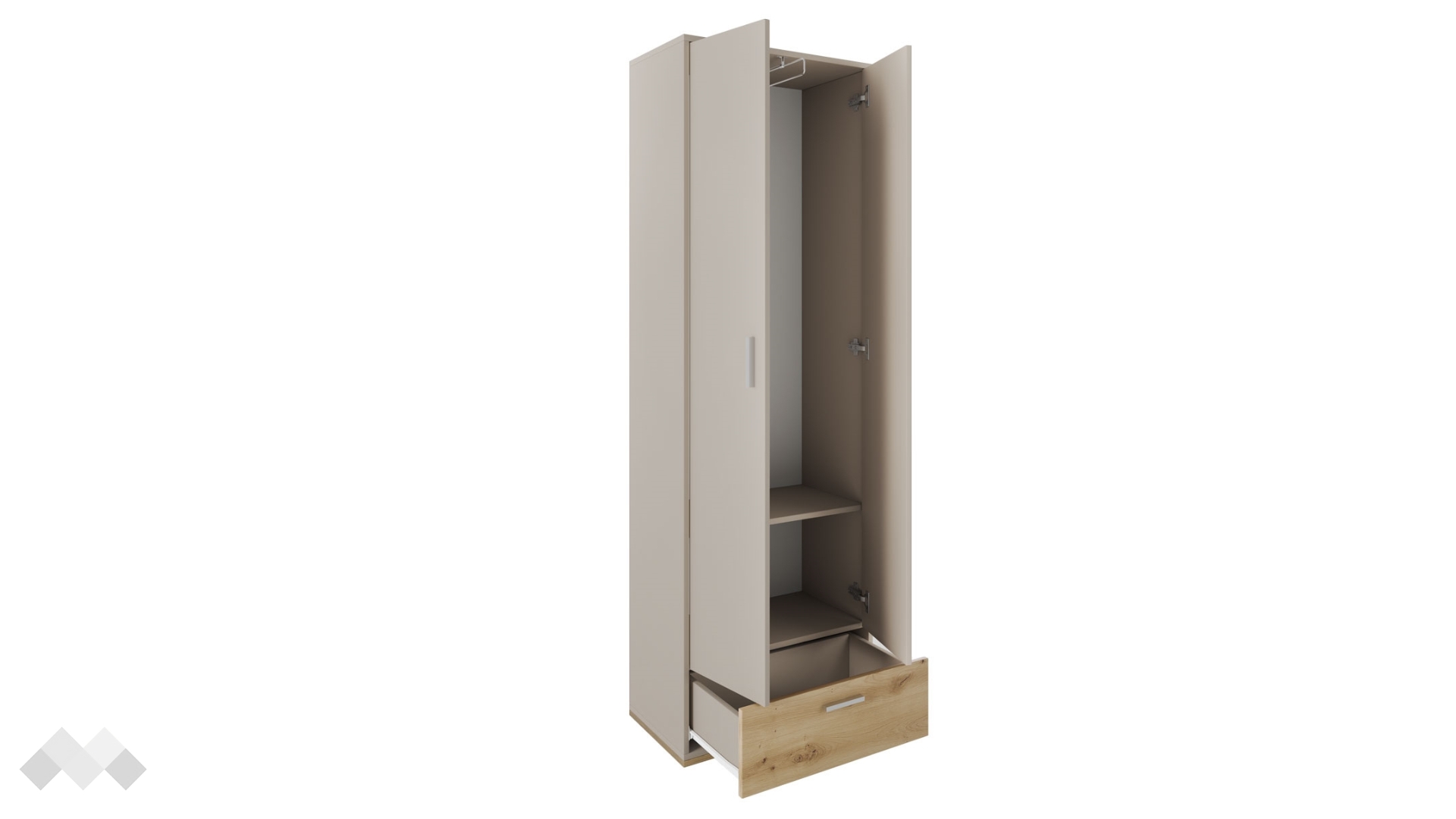 Зад крилата ще намериш широко пространство и лост за закачалки, където да съхраняваш ризи, сака или по-обемни дрехи като палта. В долната си част гардеробът изненадва с едно чекмедже, където можеш да организираш бельо, чорапи, малки електроуреди или други вещи, нуждаещи се от място.