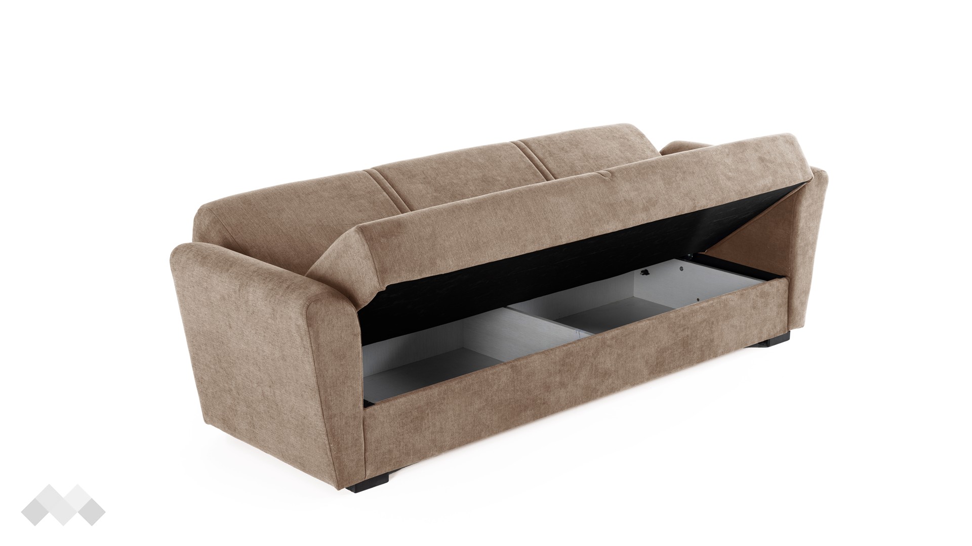 Моделът разполага с твърди подлакътници и удобна седалка, която осигурява стабилна опора и комфорт през целия ден. Практичната ракла под седалката предлага място за съхранение на спално бельо, одеяла или сезонни вещи – винаги под ръка, но извън полезрението.