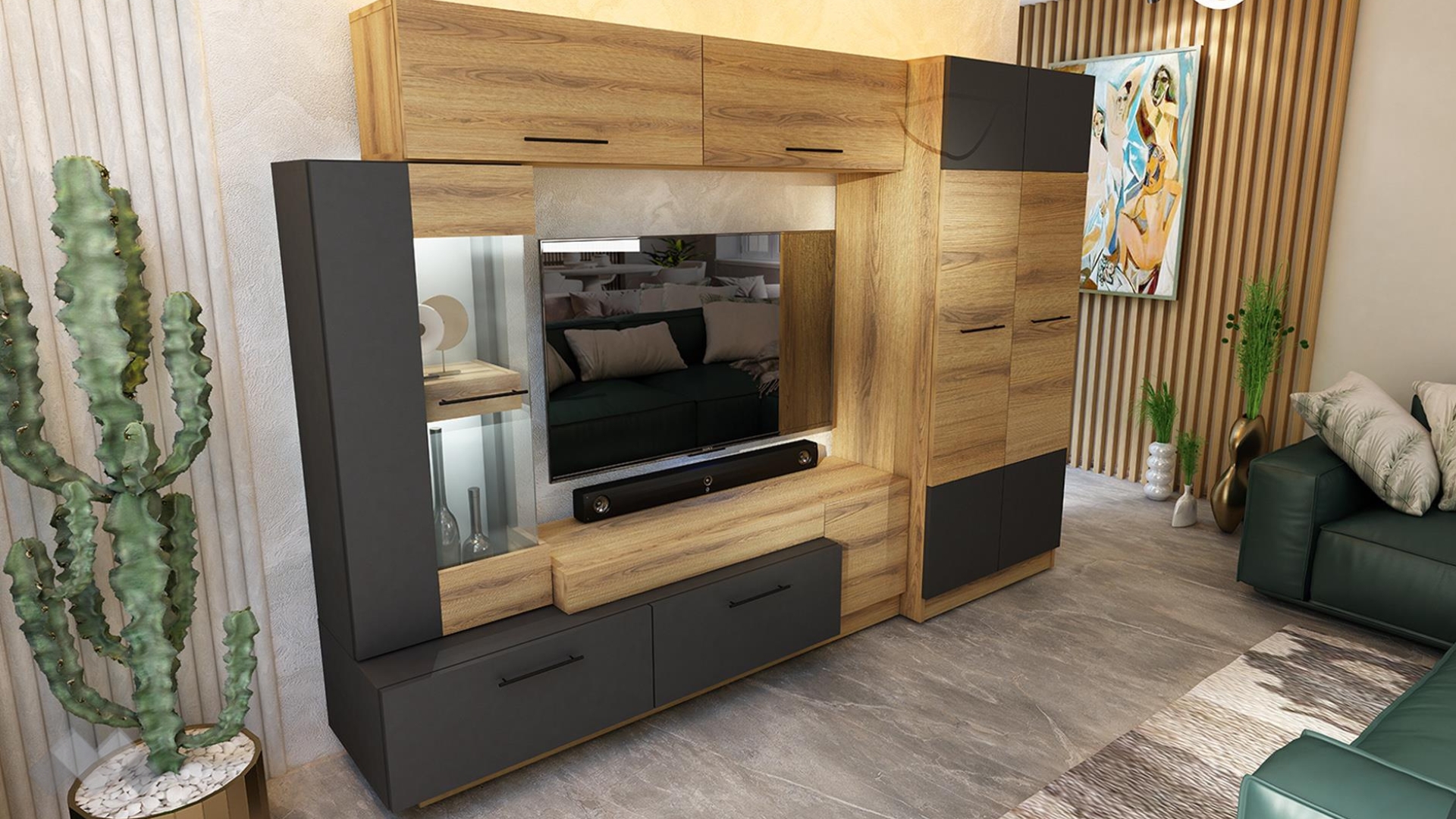 Тази стилна модулна секция съчетава съвременен дизайн и изключителна функционалност – перфектният акцент за всяка модерна дневна. Изработена в топъл дървесен декор с елегантни матови антрацитни елементи, тя създава усещане за уют, ред и баланс.