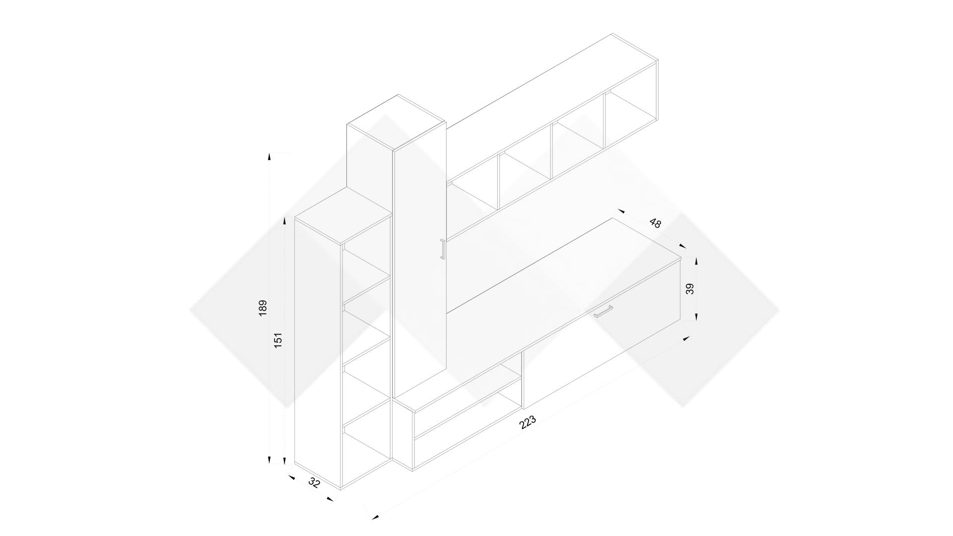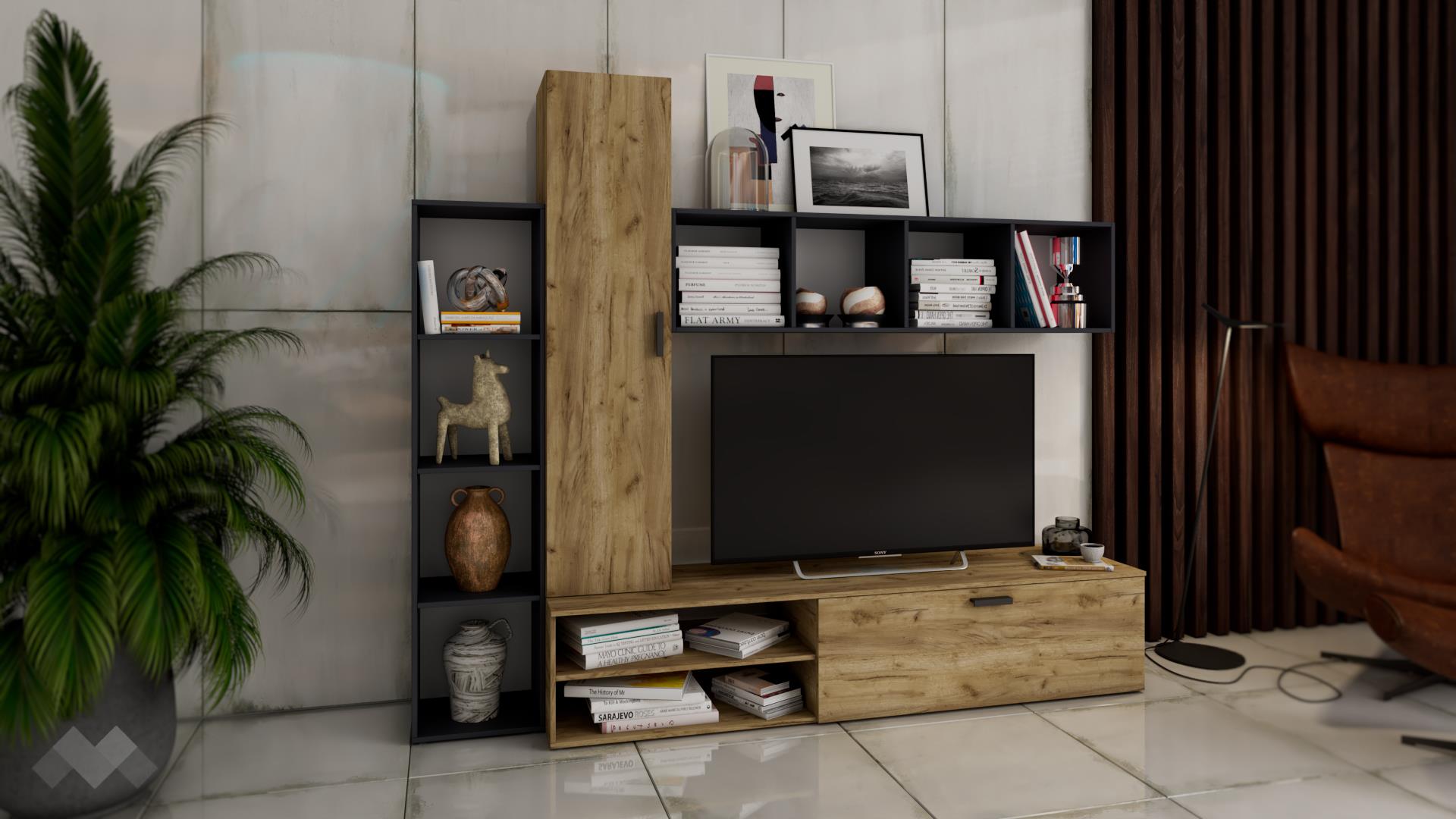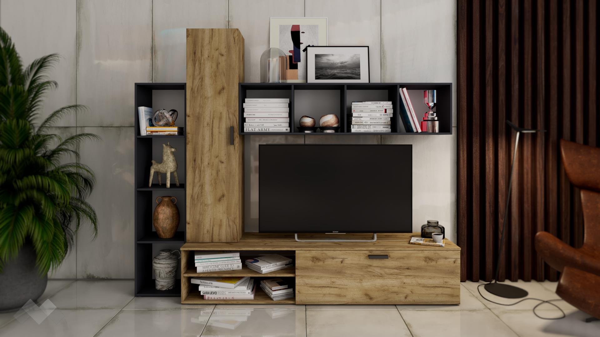 ⭐ Предимства: ✓ модерна цветова комбинация ✓ ТВ шкаф ✓ висок шкаф ✓ етажерка ✓ функционален дизайн ✓ качествена изработка ✓ 16 мм ПДЧ