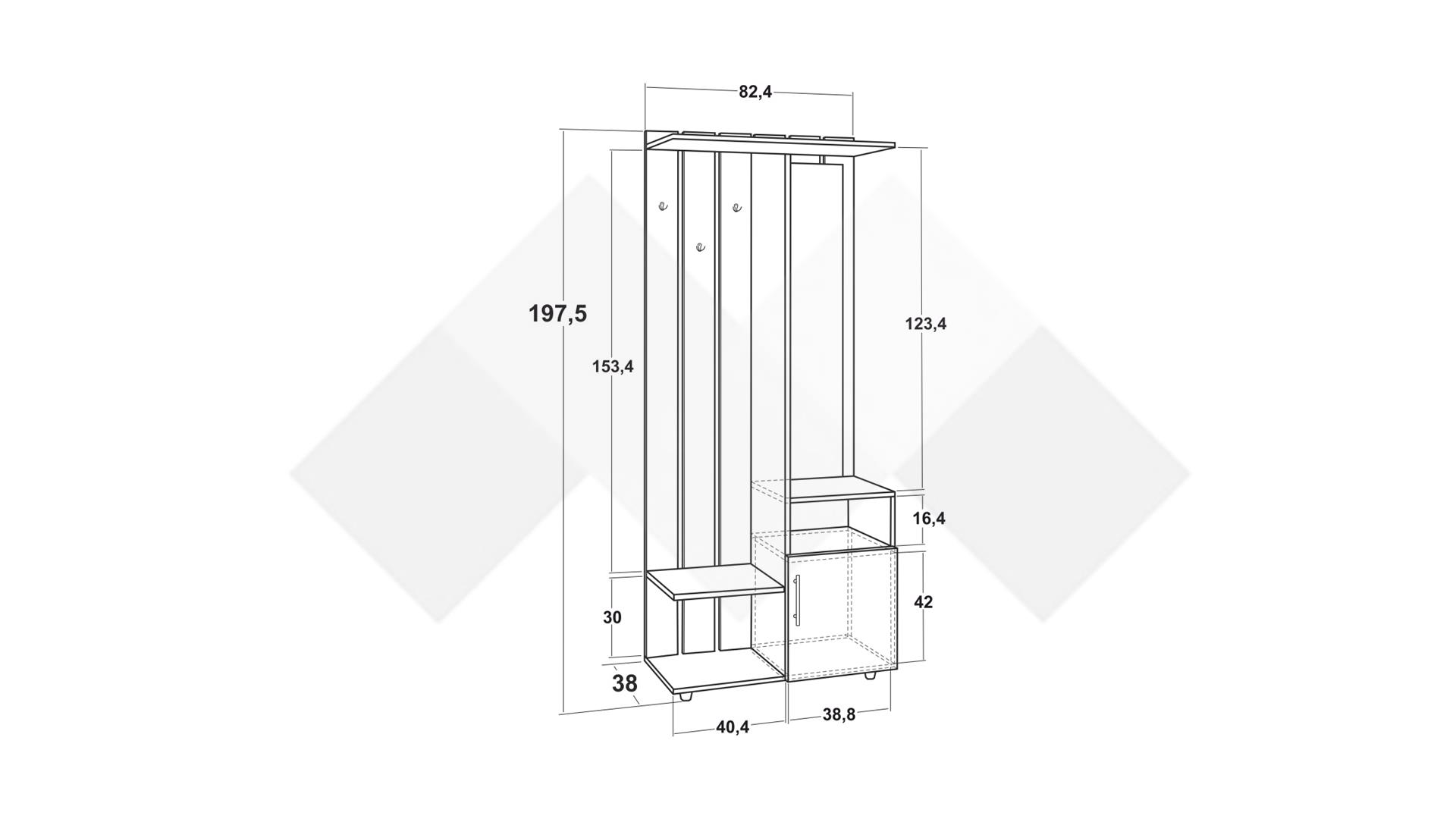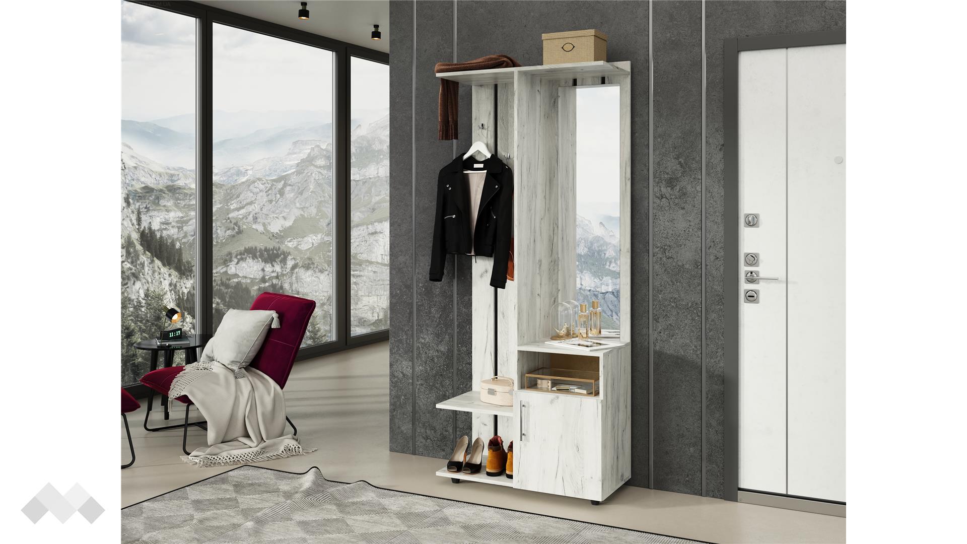 Съчетава се добре, както с цветове в сивата, така и с цветове в кафявата гама. Портманто Фрига ти предлага оптимално и функционално пространство за твоите вещи като: връхни дрехи, шапки, обувки, козметика и чадъри. Благодарение на открития рафт и допълнителния шкаф под него, разполагаш с достатъчно място за организация на всякакви вещи и дреболии.