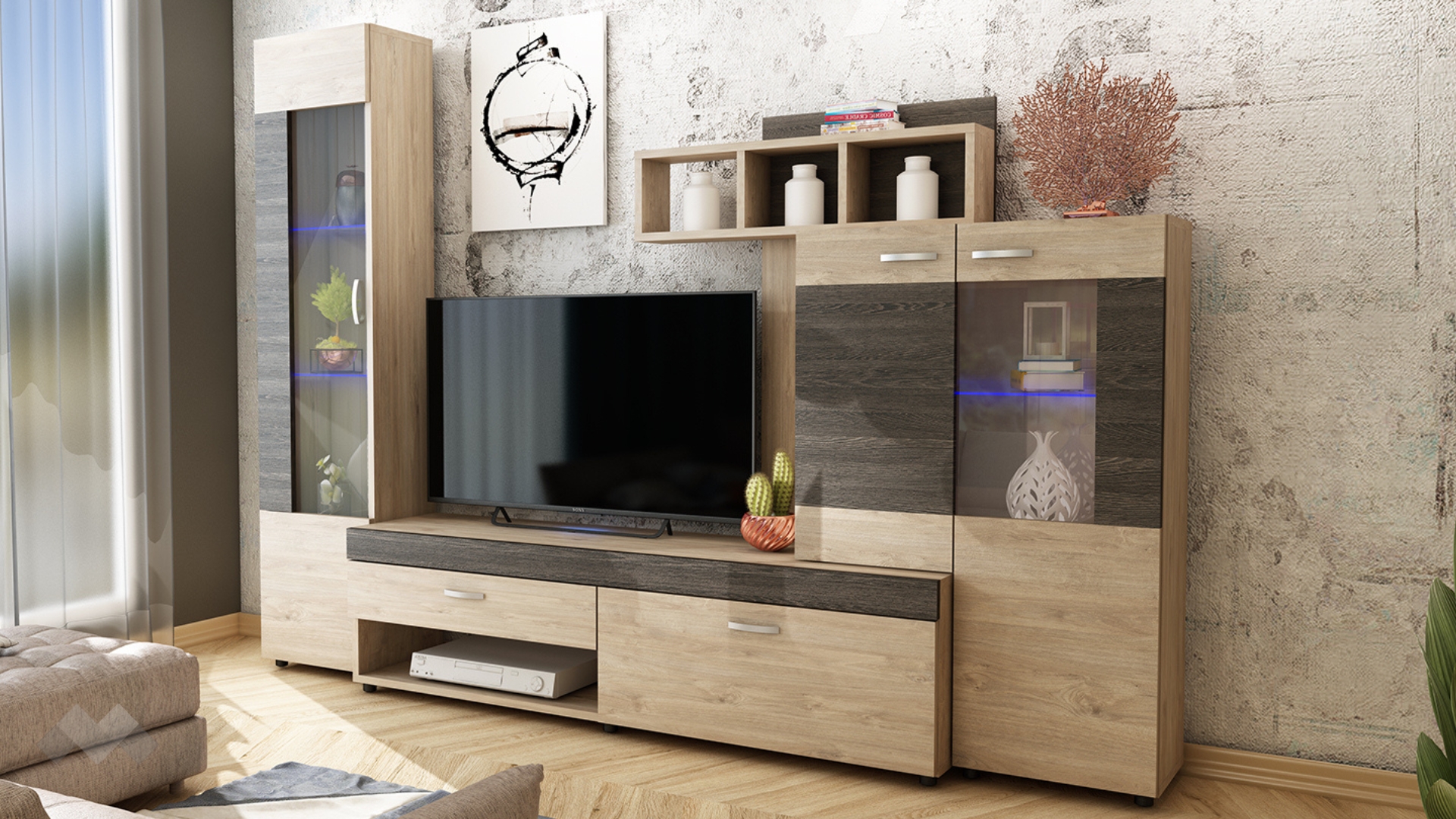 Секцията разполага с висок витринен шкаф – там ще намерят място всичките ти красиви сервизи, любими сувенири или стилни декорации. Допълнителното синьо LED осветление ще акцентира още повече върху тях и ще ги накара да засияят, благодарение на това няма как да убегнат от погледите на гостите ти. ТВ шкафа предлага достатъчно пространство, където да поставиш цялата си съпътстваща техника като ТВ приемници, DVD плейъри и други. Можеш да ги организираш, където пожелаеш - в затворено шкафче, чекмедже или една отворена ниша. До него се намира още един голям шкаф, в който можеш да прибереш по-обемни вещи, ел. уреди или други необходими вещи, а в остъклената му част ще намериш още място за неща, които не искаш да останат скрити. Към шкафа също е включено синьо LED осветление.