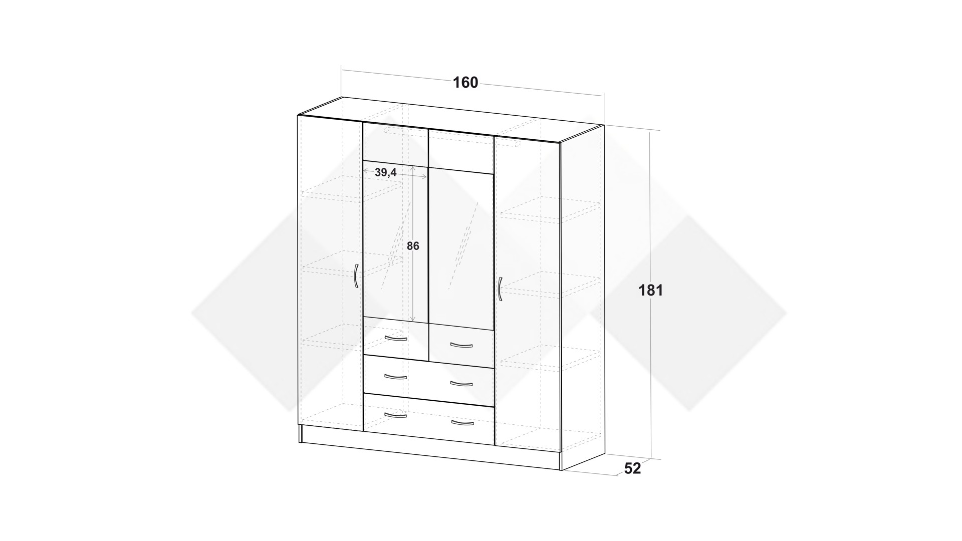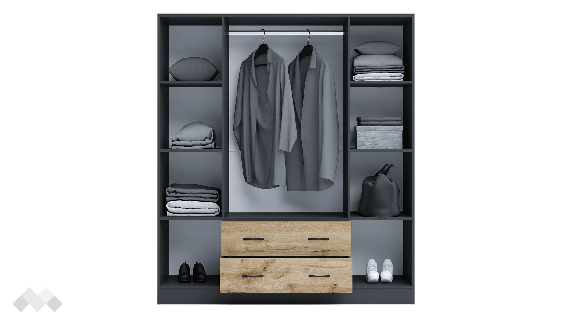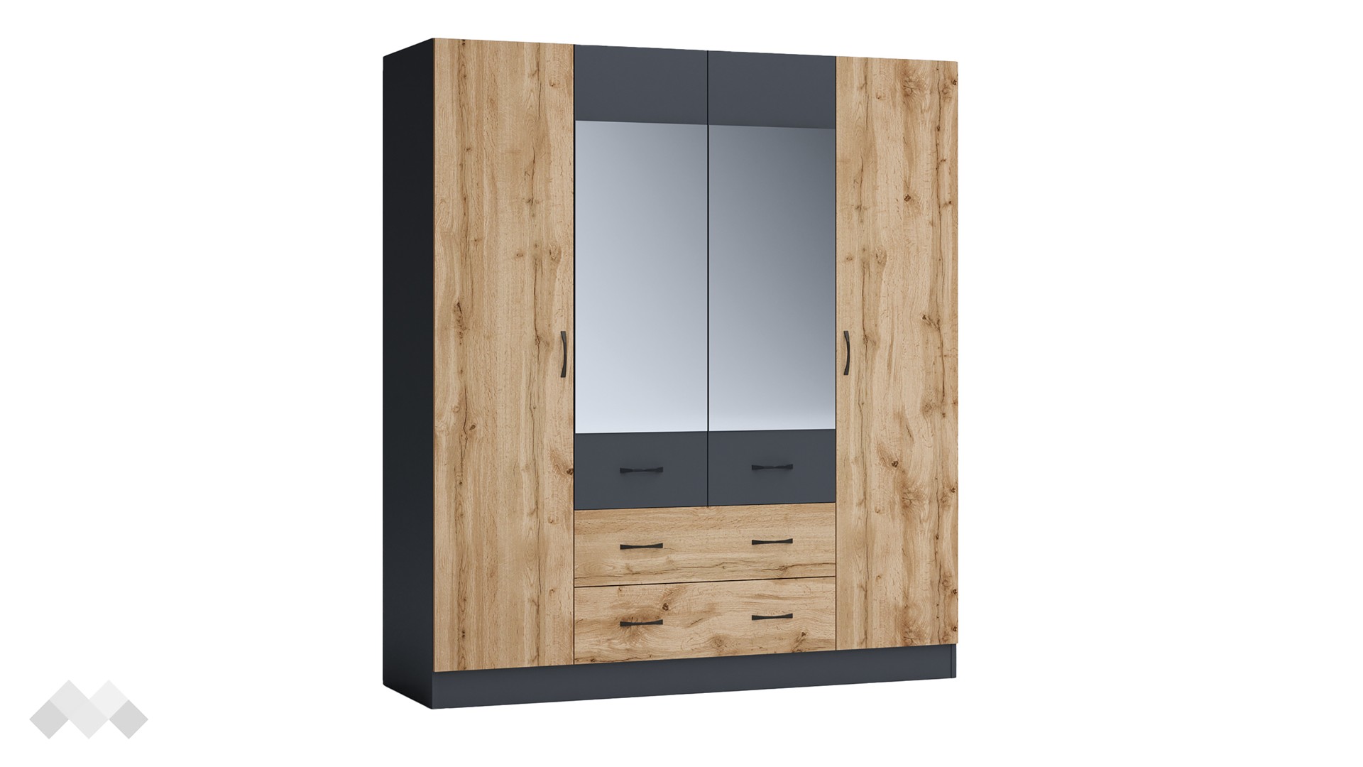 Четирикрилен гардероб с чекмеджета Галати съчетава стилен дизайн и висока функционалност, предоставяйки максимален комфорт и удобство за ежедневието ти. Вътрешните рафтове предлагат обширно пространство за съхранение на сгънати дрехи, кутии за обувки или други предмети, които искаш да бъдат организирани и лесно достъпни. Лостът за закачалки осигурява достатъчно място за съхранение на ризи, сака, рокли и други дрехи, които трябва да бъдат окачени, запазвайки ги в перфектно състояние.