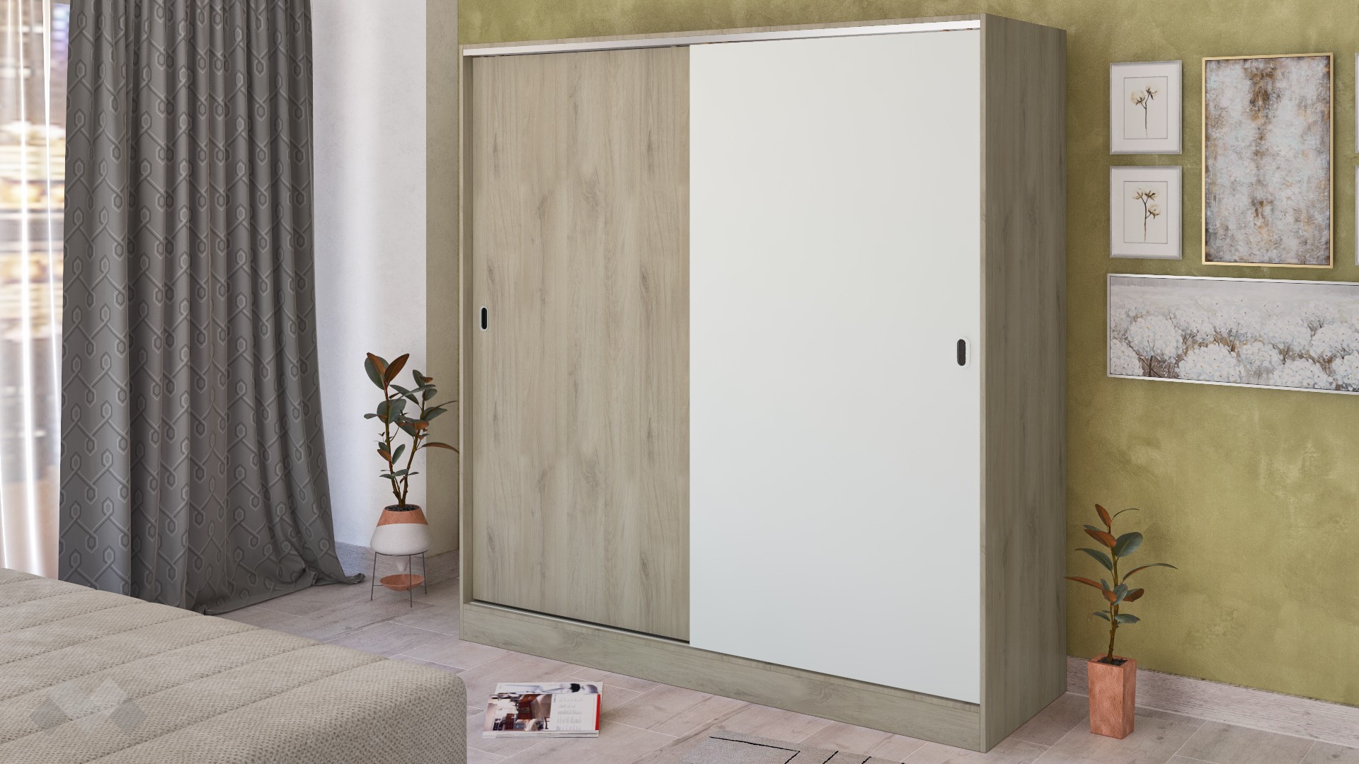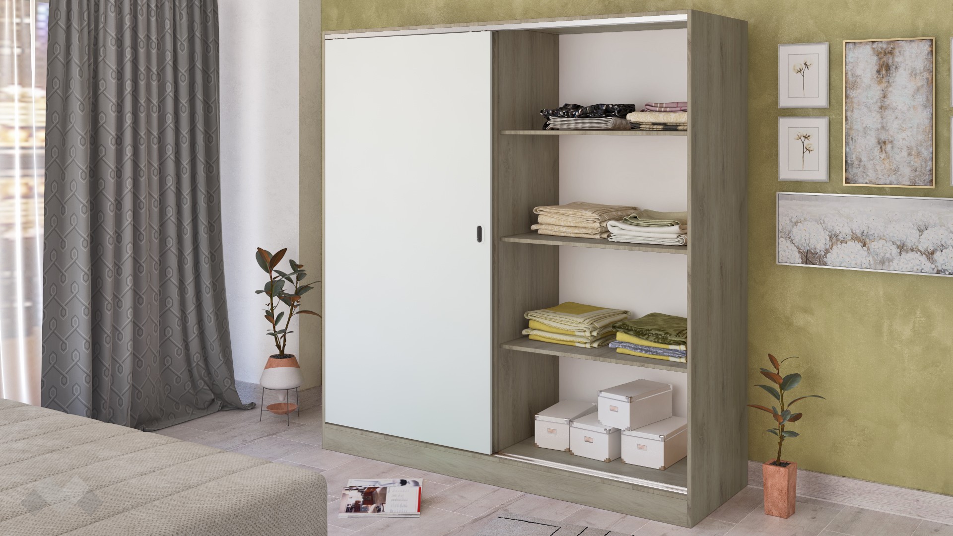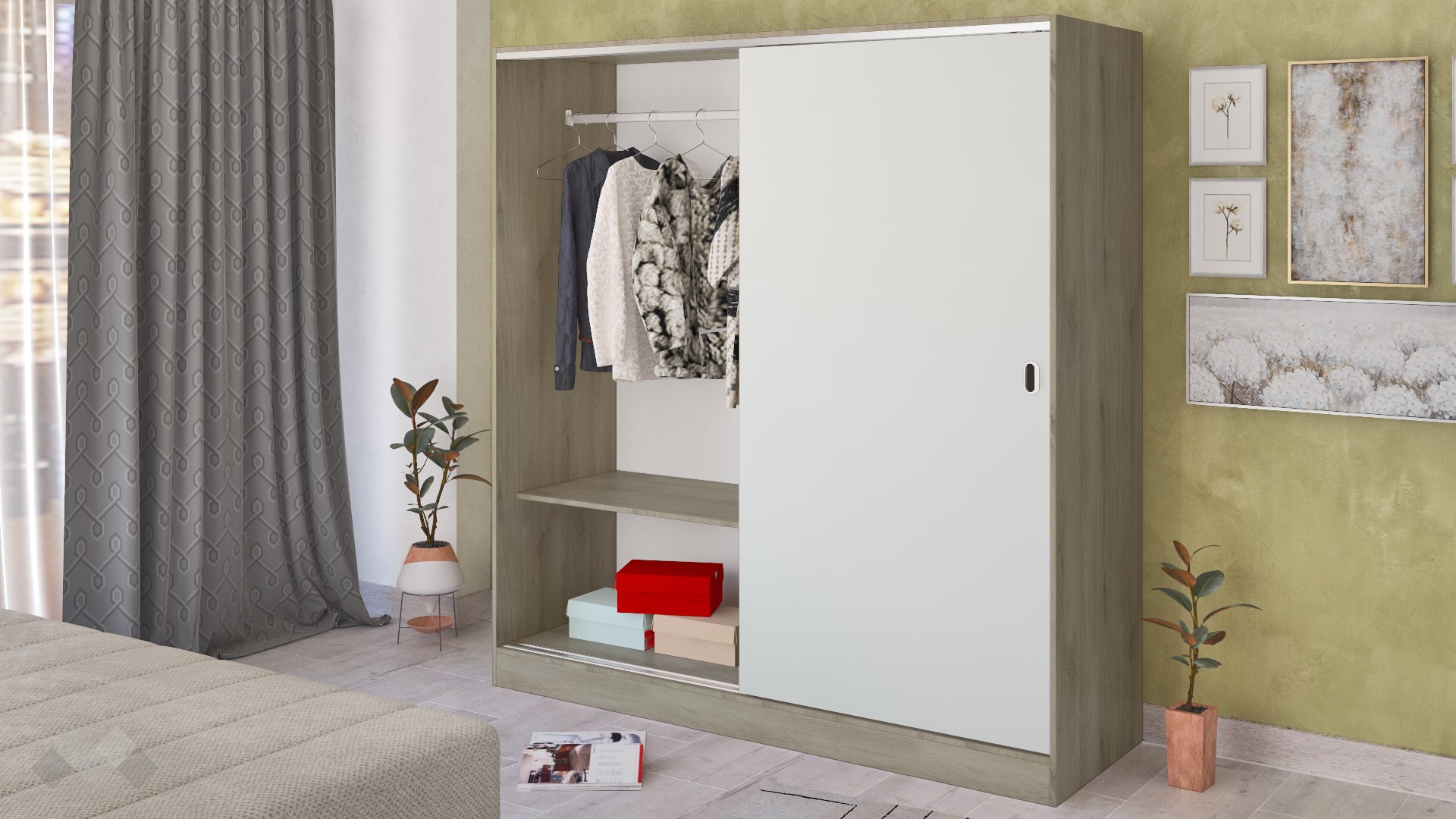 Гардероб Глендейл е перфектният избор за почитателите на практичните мебели със семпъл и изчистен дизайн. Той е двукрилен гардероб с плъзгащи врати и външен механизъм. Модерният плъзгащ механизъм прави отварянето на вратите леко и приятно, без да е необходимо допълнително пространство пред тях. Щом ги отвориш, вътре ще откриеш четири големи рафта с оптимална височина и просторно крило за закачалки.