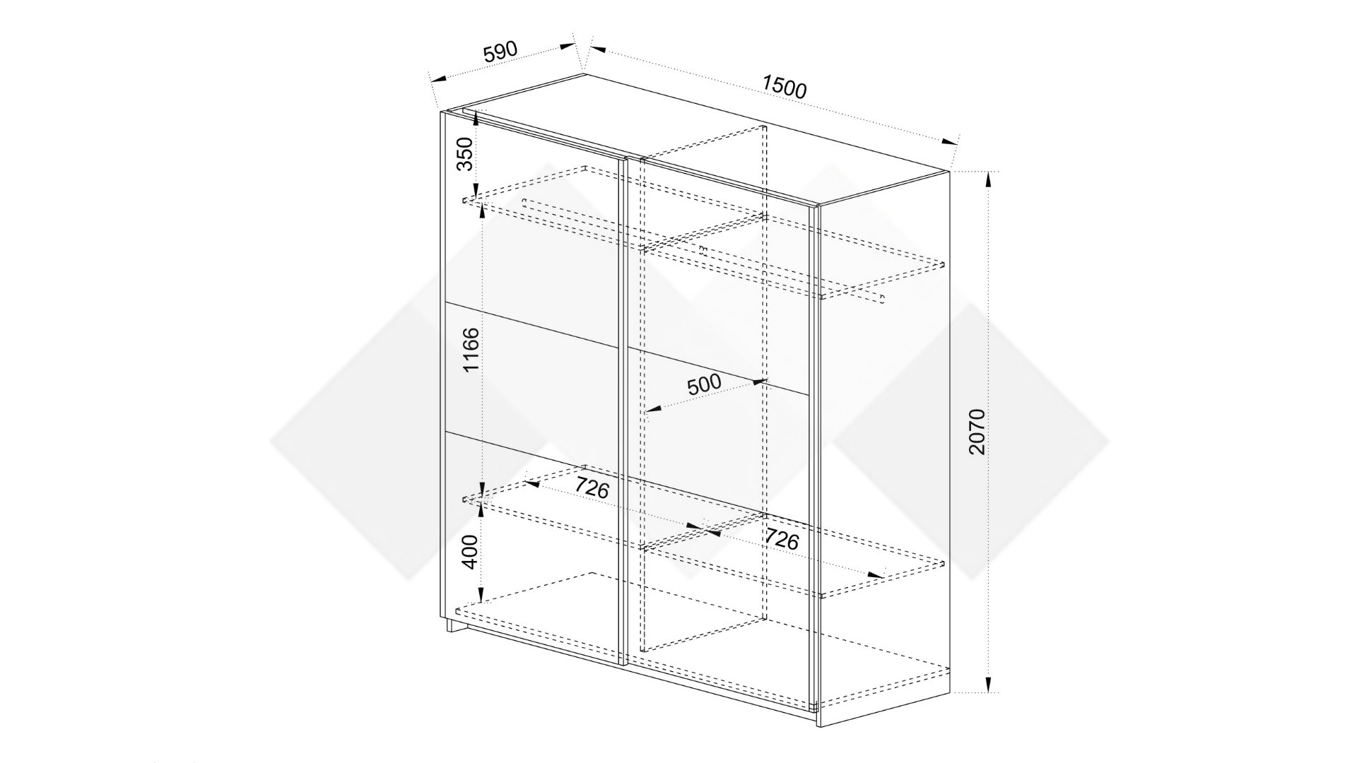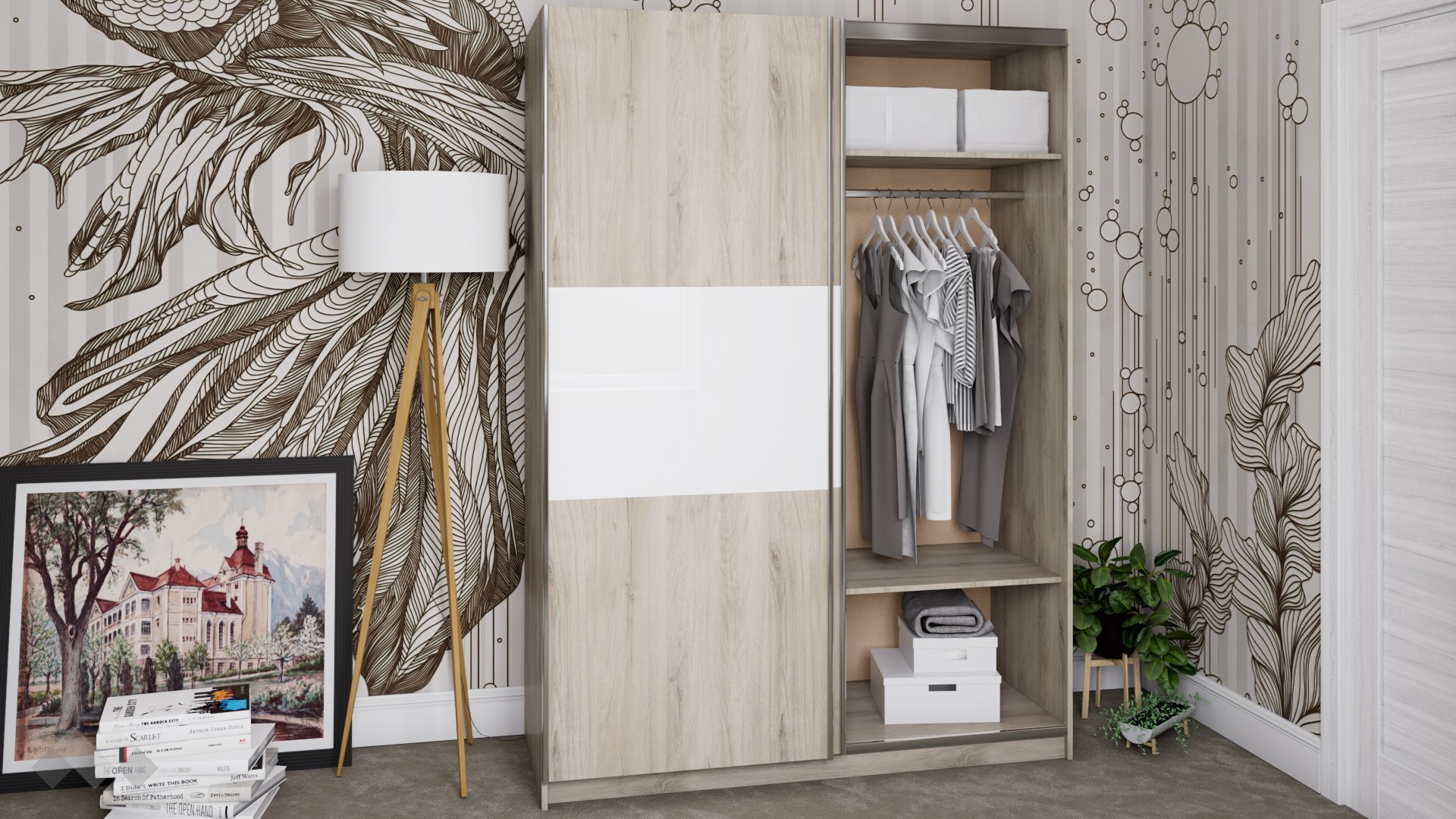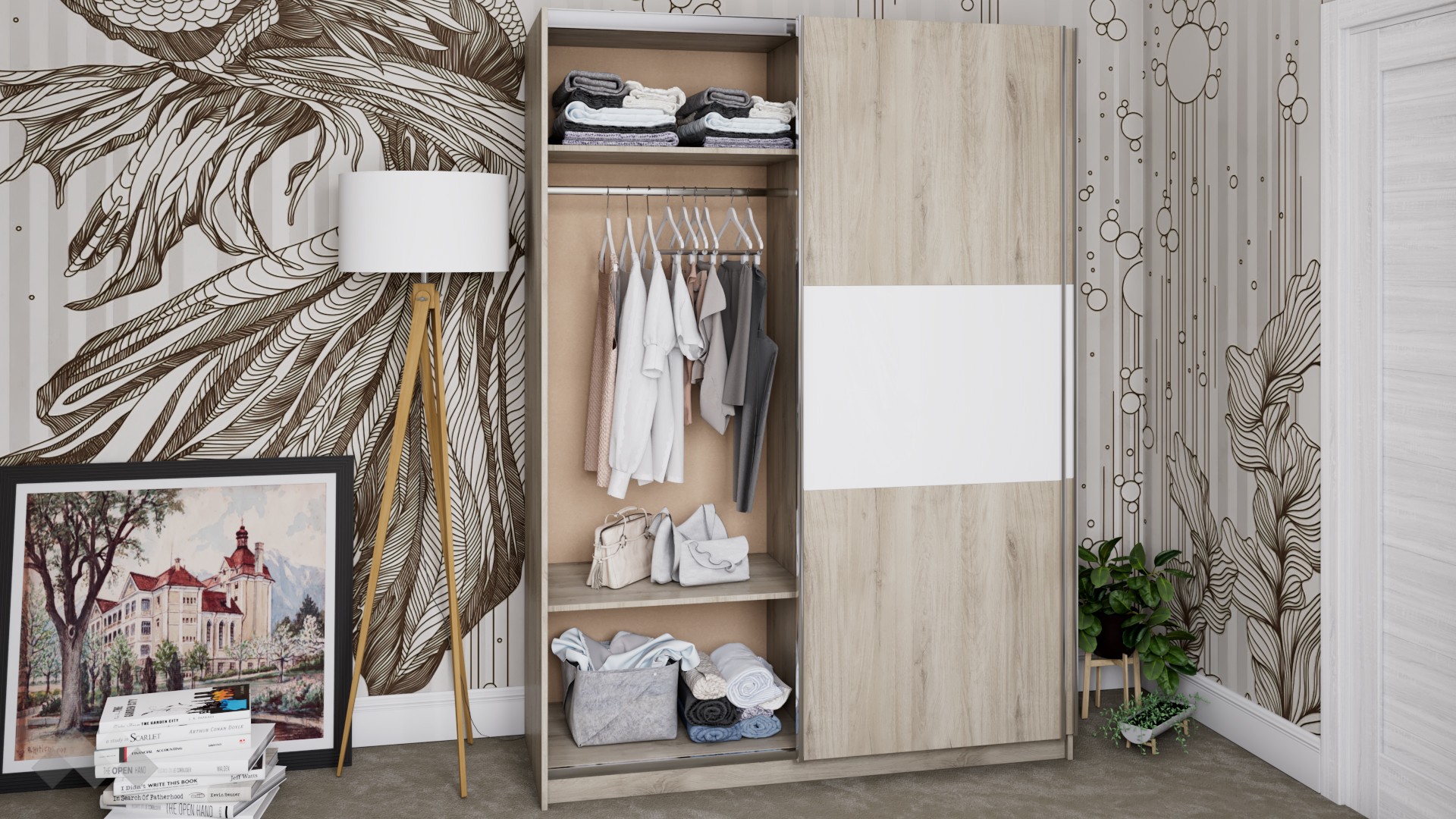 Гардероб Хартфорт е с плъзгащи врати. Това го прави подходящ избор дори за най-малките спални, тъй като за отварянето им не се нуждаеш от допълнително пространство. В същото време дълбочината на гардероба позволява съхранение и на по-обемни вещи. На твое разположение са общо четири рафта и два лоста за закачалки. На рафтовете можеш да подредиш сгънати дрехи, завивки, възглавници, аксесоари, куфари или други необходими за теб неща. Лостовете за закачалки са идеални за организиране на палта, по-обемни връхни дрехи или елегантното облекло, което се мачка много лесно.