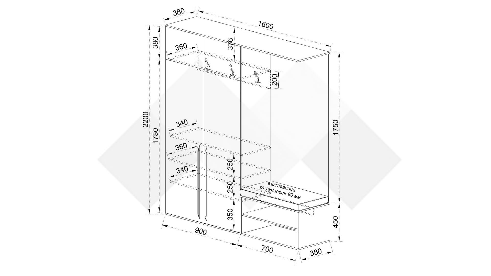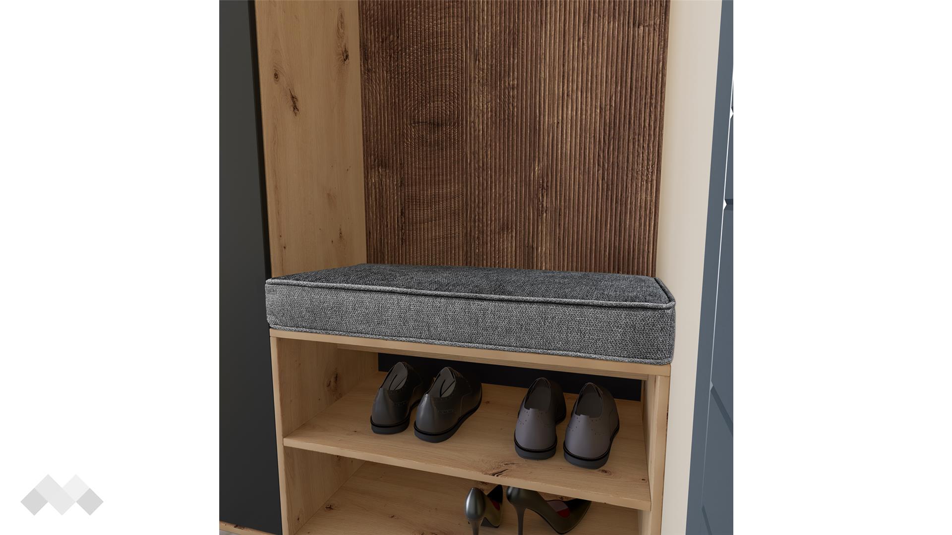 Непосредствено над гардероба има удобен шкаф, с пуш механизъм за отваряне на вратите, който ти дава допълнително място за съхранение на кутии с обувки, чанти или други принадлежности. Моделът разполага с удобна седална част с тапицирана възглавничка в сив плат и два отворени рафта за обувки.