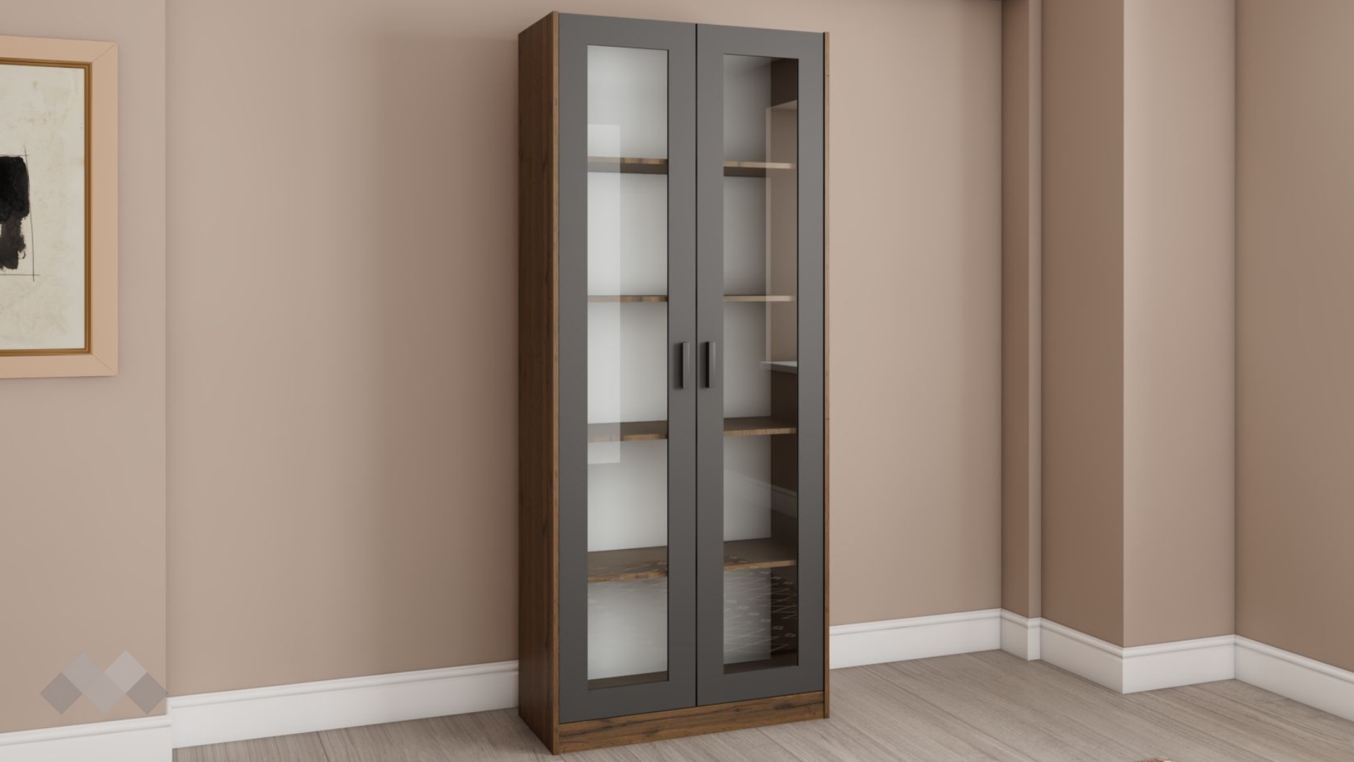 ⭐ Предимства: ✓ голямо и функционално място за съхранение ✓ практично разпределение ✓ елегантен дизайн ✓ модерен декор с WNR структура ✓ две остъклени врати ✓ 4 рафта ✓ висококачествена изработка ✓ 16 мм ПДЧ
