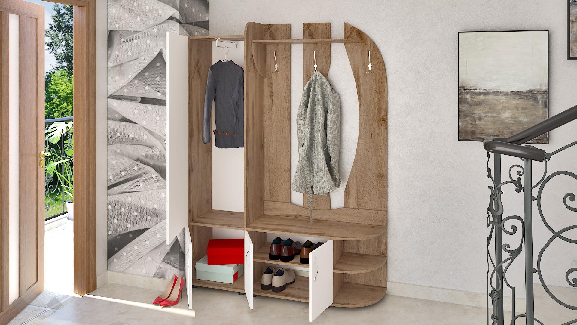 В долната част на портмантото разполагаш със затворени шкафове и един отворен рафт. Там може да прибереш от 6 до 10 чифта обувки, да подредиш кутии или други необходими неща.