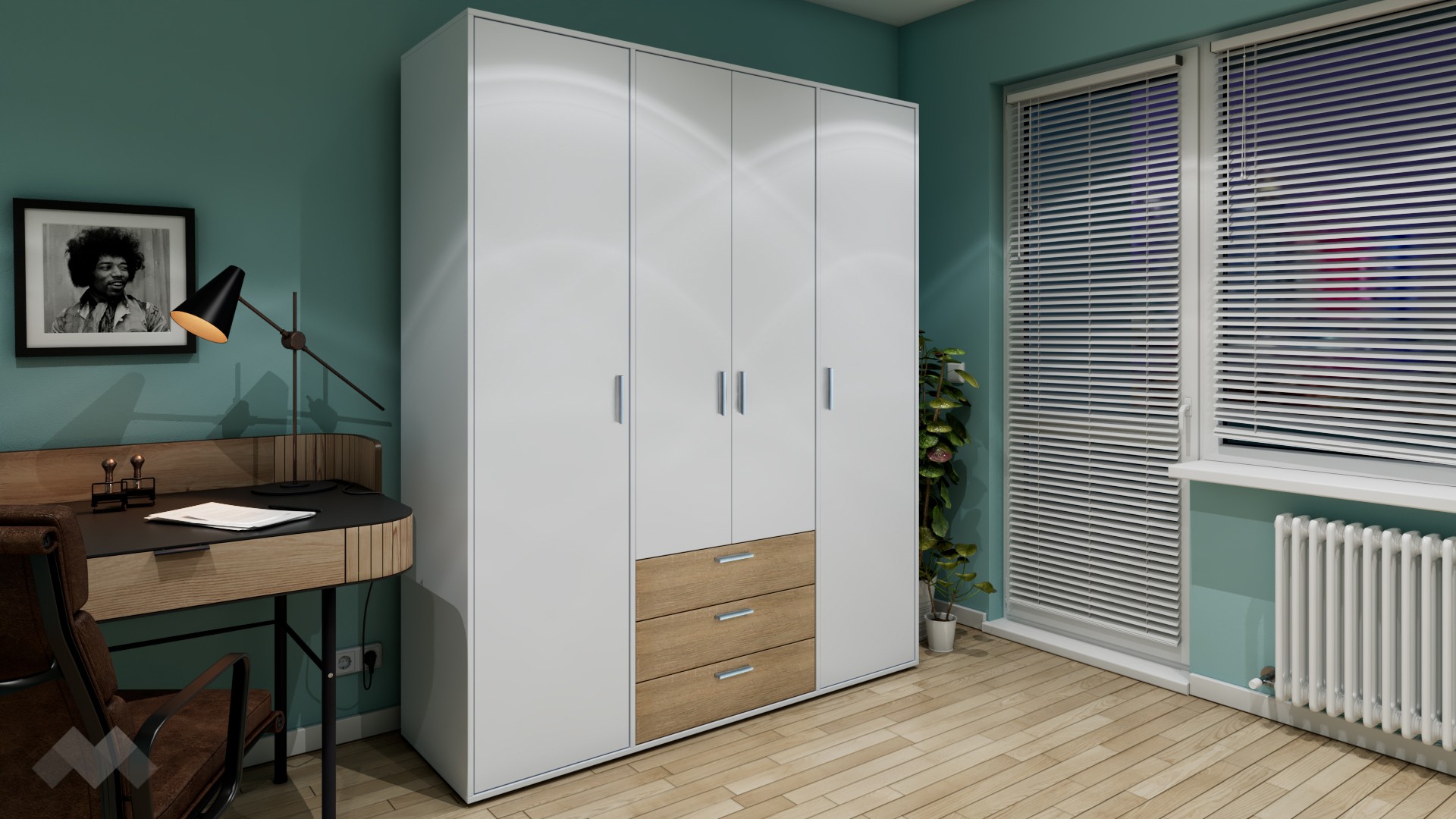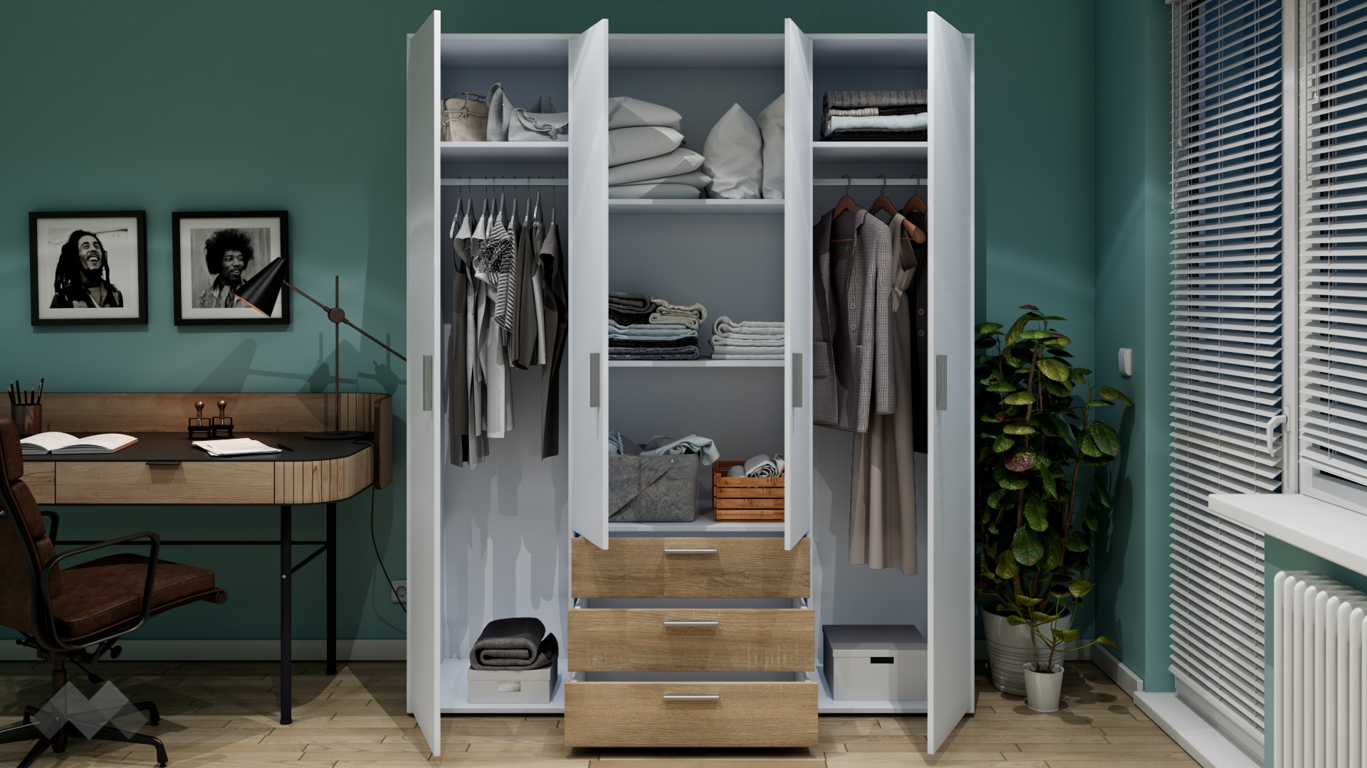 На твое разположение са два лоста за закачалки, където можеш да съхраняваш ризи, сака или палта. Гардеробът е с четири рафта, на които можеш да организираш сгънати дрехи, хавлии, завивки или аксесоари. За още по-голямо удобство сме добавили и три просторни чекмеджета, подходящи за съхранение на бельо, чорапи или дребни принадлежности.
