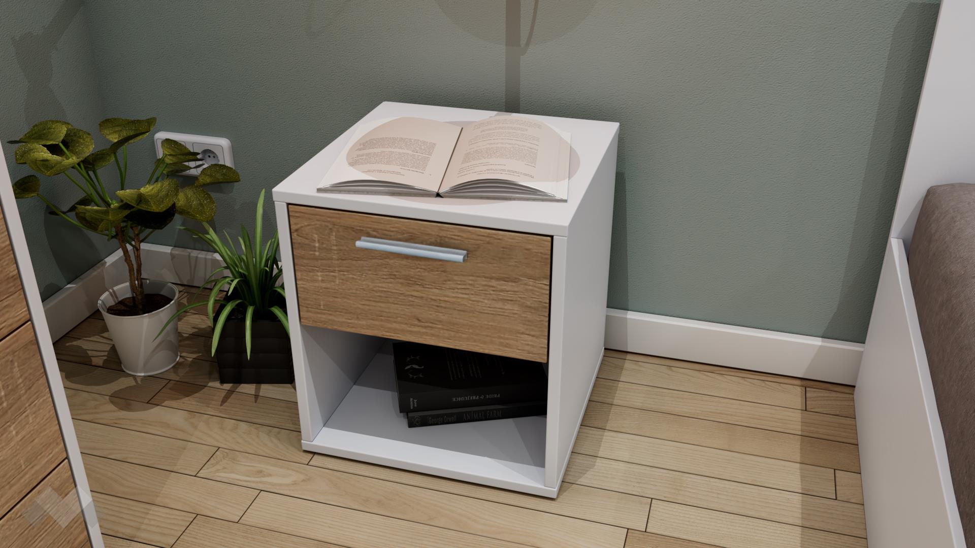 Нощно шкафче Жизел е малко, но практично. Благодарение на оптималната му височина, то ще пасне на всяко легло. Чекмеджето и отвореният рафт ти предоставят достатъчно място за съхранение на всички най-необходими вещи, за да са винаги на една ръка разстояние. Върху горния плот можеш да поставиш нощна лампа или книгата, която четеш преди сън.