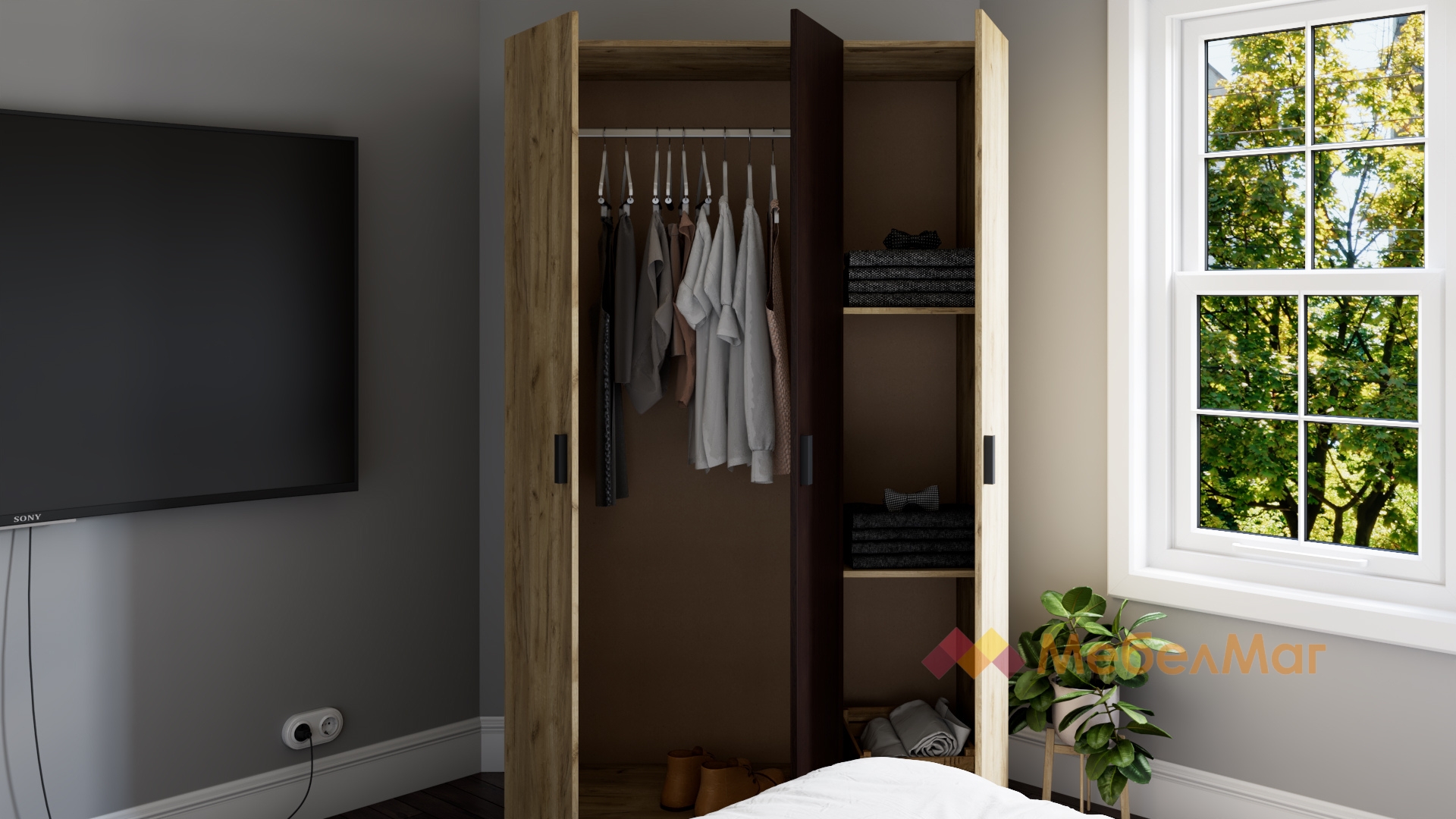 Ще ти допадне и включеният трикрилен гардероб. Той е практично разпределен, изцяло отговарящ на съвременните стандарти за съхранение на дрехи. Зад дясното крило се крият два рафта, на които можеш да подредиш сгънати дрехи, завивки или кутии за съхранение. От лявата страна е разположен лост за закачалки, подходящ за съхранение на елегантното облекло, което се мачка много лесно.