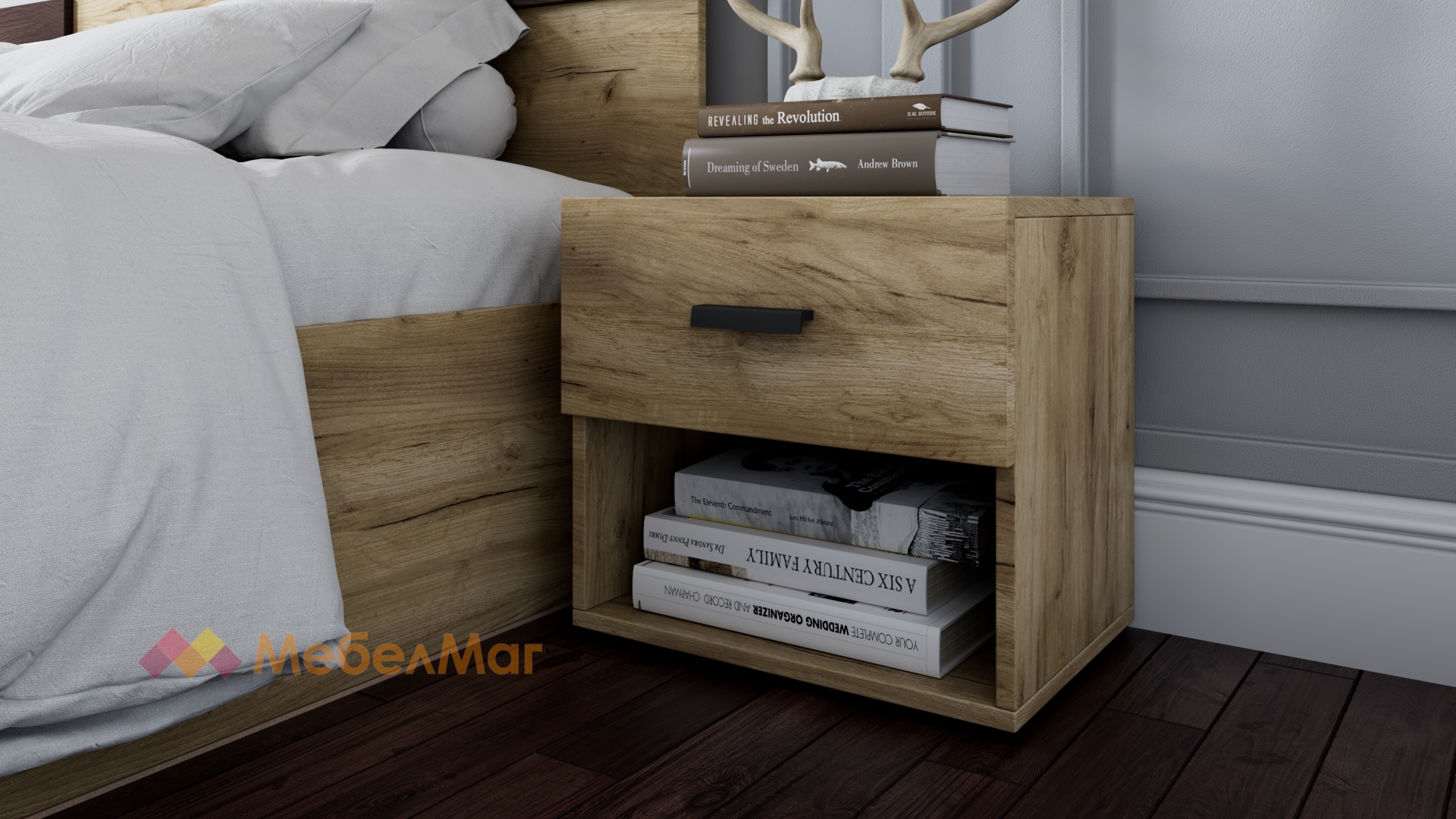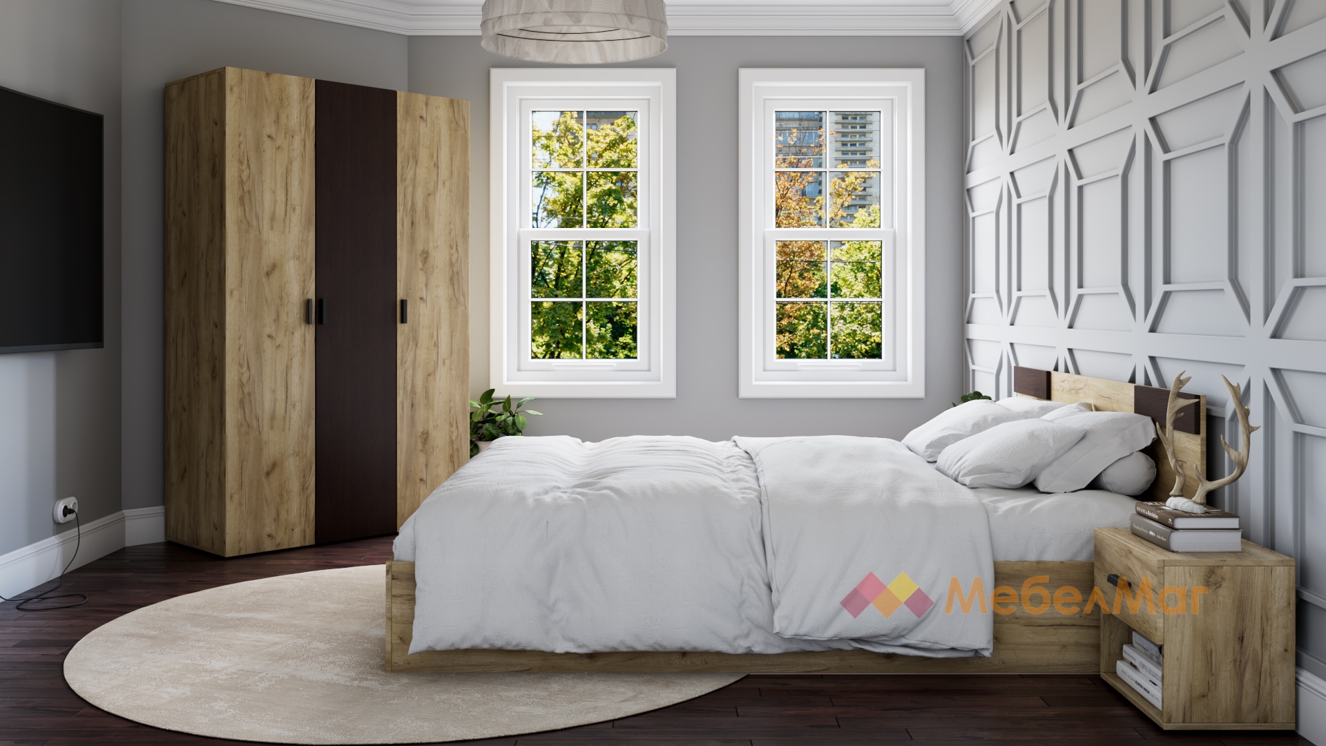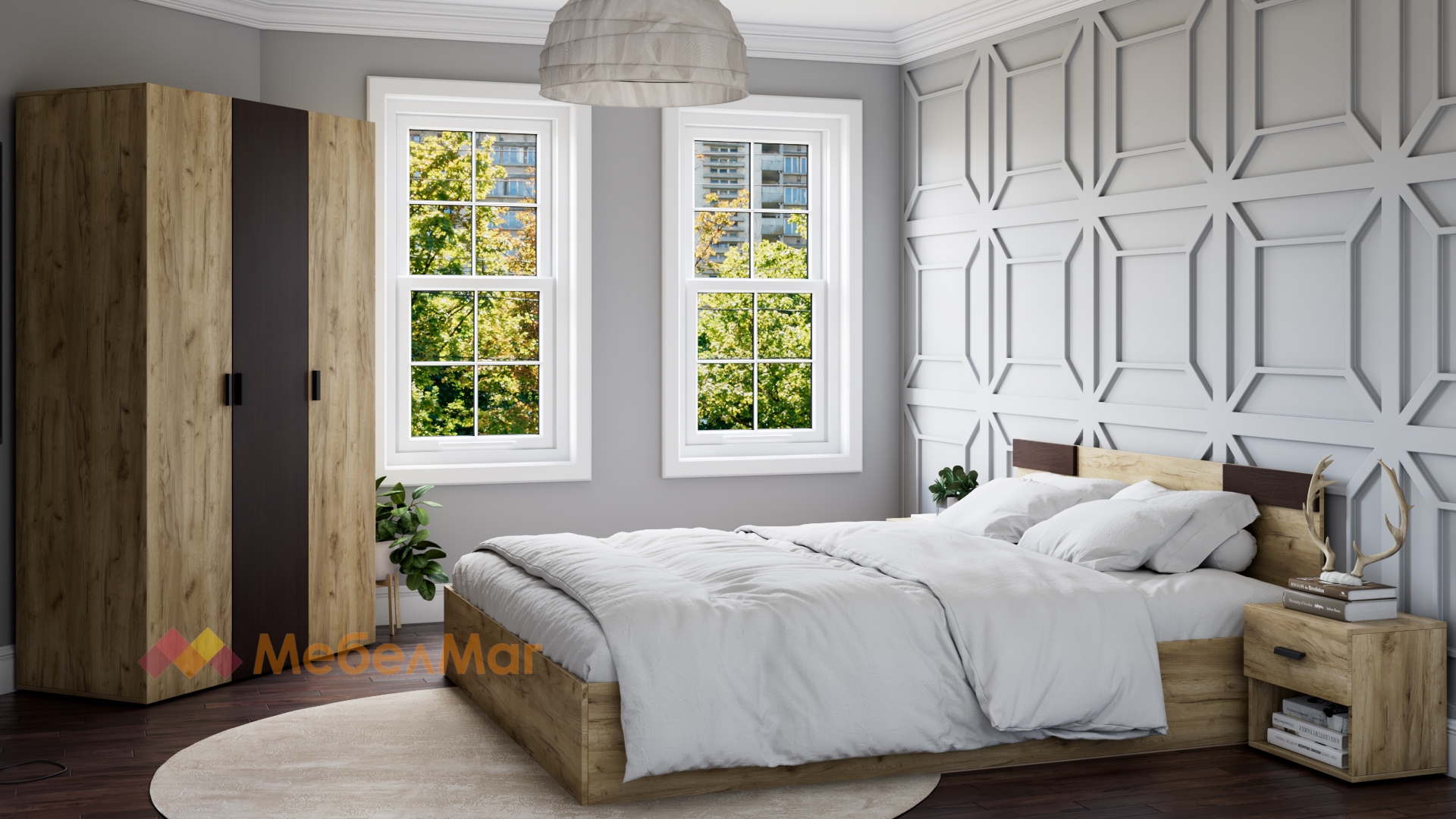 Спалнята предлага уют и комфорт. Тя е подходяща за матрак с размер 160/200 см. Таблата е достатъчно висока и удобна за облягане при четене на книга или гледане на телевизия. Освен това, тя е декорирана с акцентиращи елементи в цвят венге, което допринася за елегантната визия на комплекта. Двете нощни шкафчета разполагат с чекмедже, под което има отворен рафт. Те са идеалното място за кокетна нощна лампа, любимата книга или други необходими вещи, които искаш винаги да ти бъдат под ръка.
