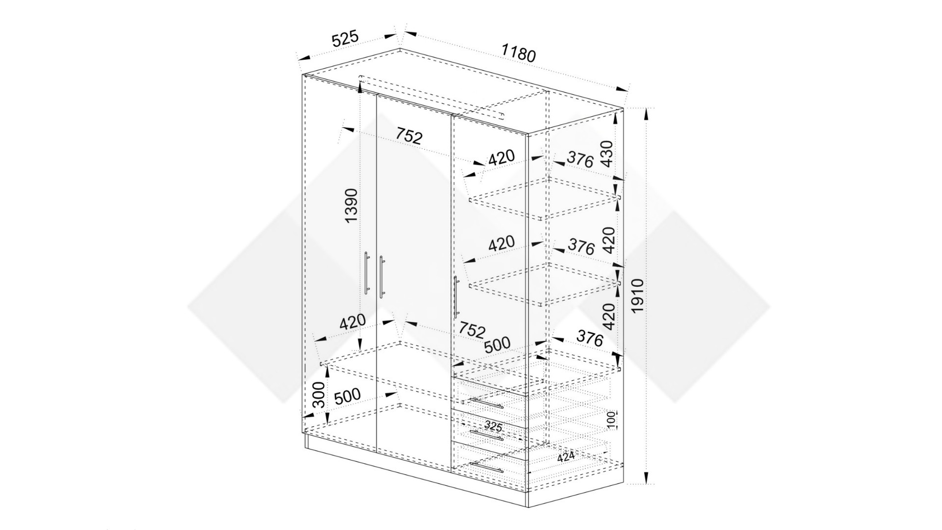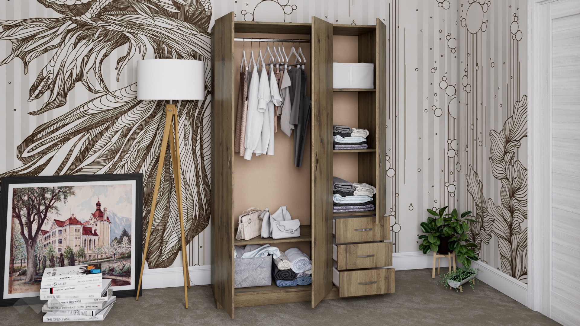 Зад дясното крило на гардероба се крият два рафта, на които можеш да разположиш сгънати дрехи, аксесоари или други необходими за теб вещи. За още по-голямо удобство сме добавили и три чекмеджета, подходящи за съхранение на бельо, чорапи, малки електрически уреди и дребни принадлежности. От лявата страна разполагаш с лост за закачалки, подходящ за елегантното облекло, което се мачка лесно. Под лоста ще откриеш още един широк рафт, където можеш да организираш възглавници, завивки, по-обемни пуловери или кутии за съхранение.