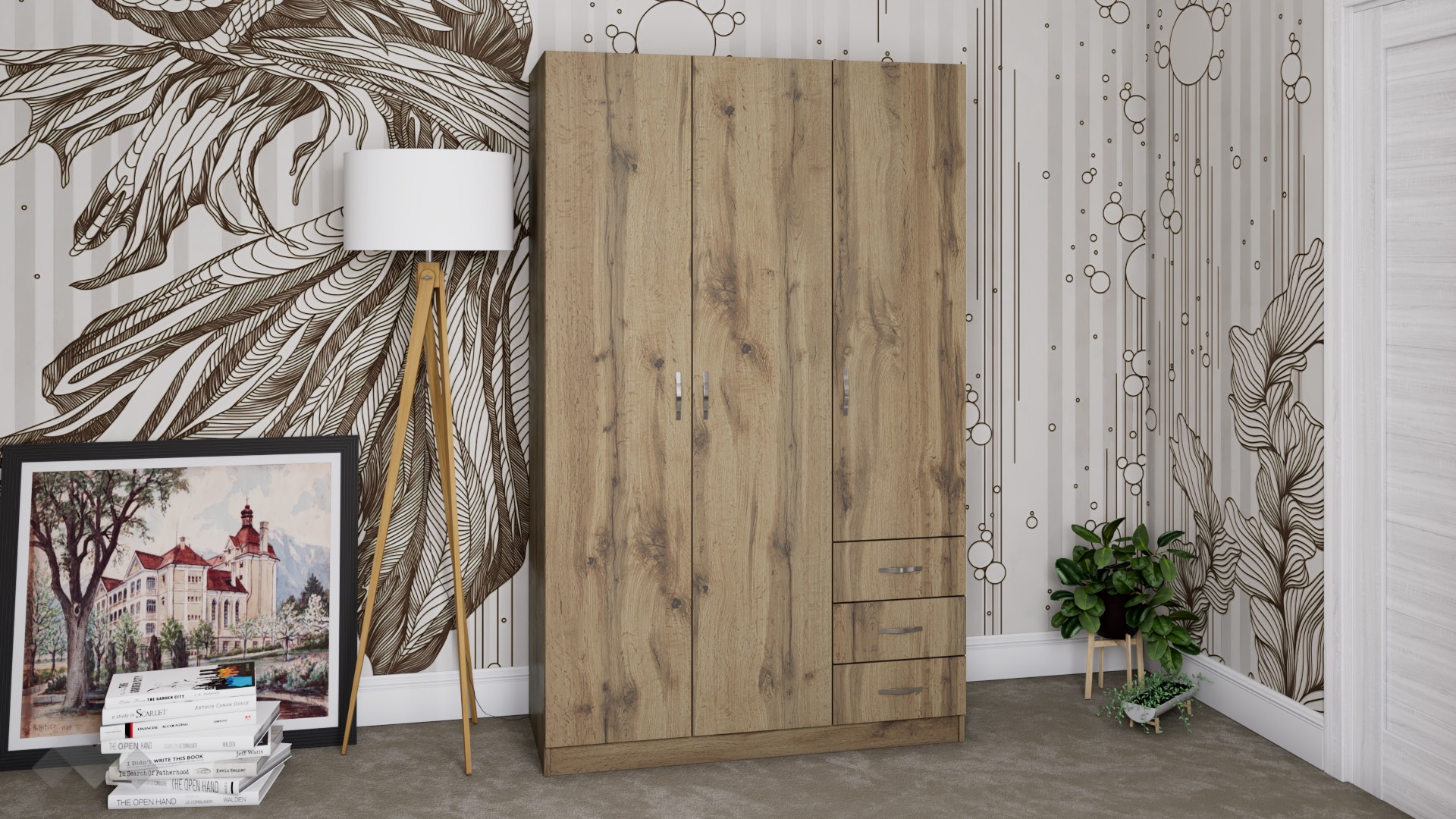 Качественият и умело проектиран гардероб е от ключово значение, за да се радваш на добре организиран и подреден дом. Всяка дреха ще намери своето подходящо място, а ежедневният избор на тоалет ще се превърне в лесен и приятен ритуал, който няма да отнема от времето ти. Затова ние ти предлагаме трикрилен гардероб Калия. Той ще те впечатли с функционалното разпределение, което ще ти позволи да подредиш добре всички дрехи и аксесоари. Благодарение на изчистения и модерен дизайн този гардероб би се вписал във всеки интериор.