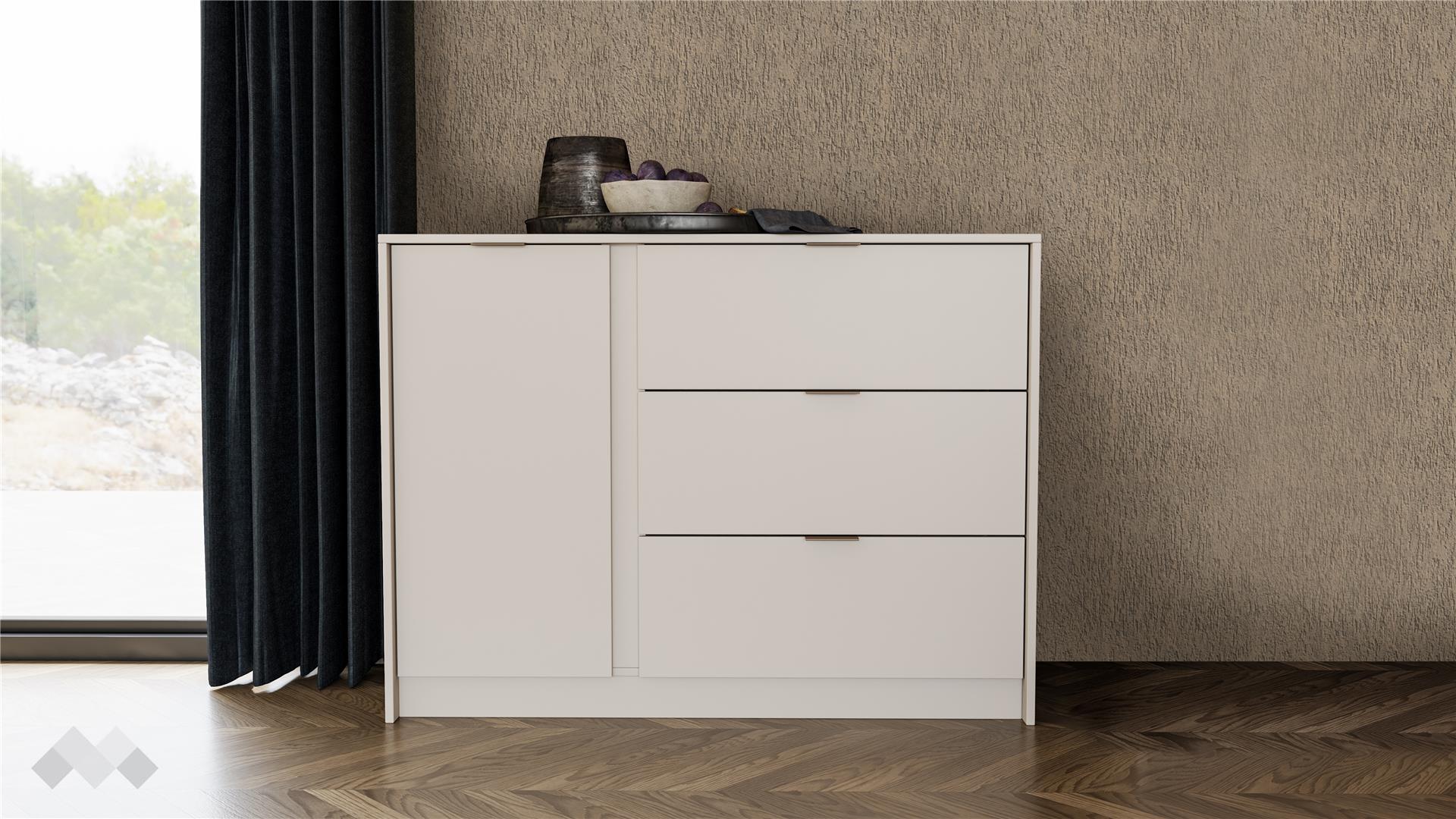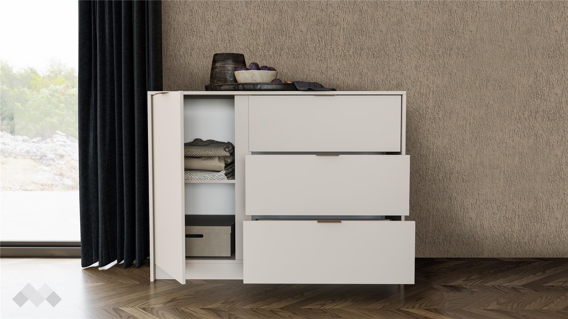 Скринът ти има три чекмеджета и един шкаф с рафт, които ти предоставят достатъчно място за съхранение на лични вещи, козметика и други. Чекмеджетата са снабдени със сачмени водачи с пълно изтегляне, които осигуряват пълен достъп до съдържанието и гарантират дълготрайна устойчивост.