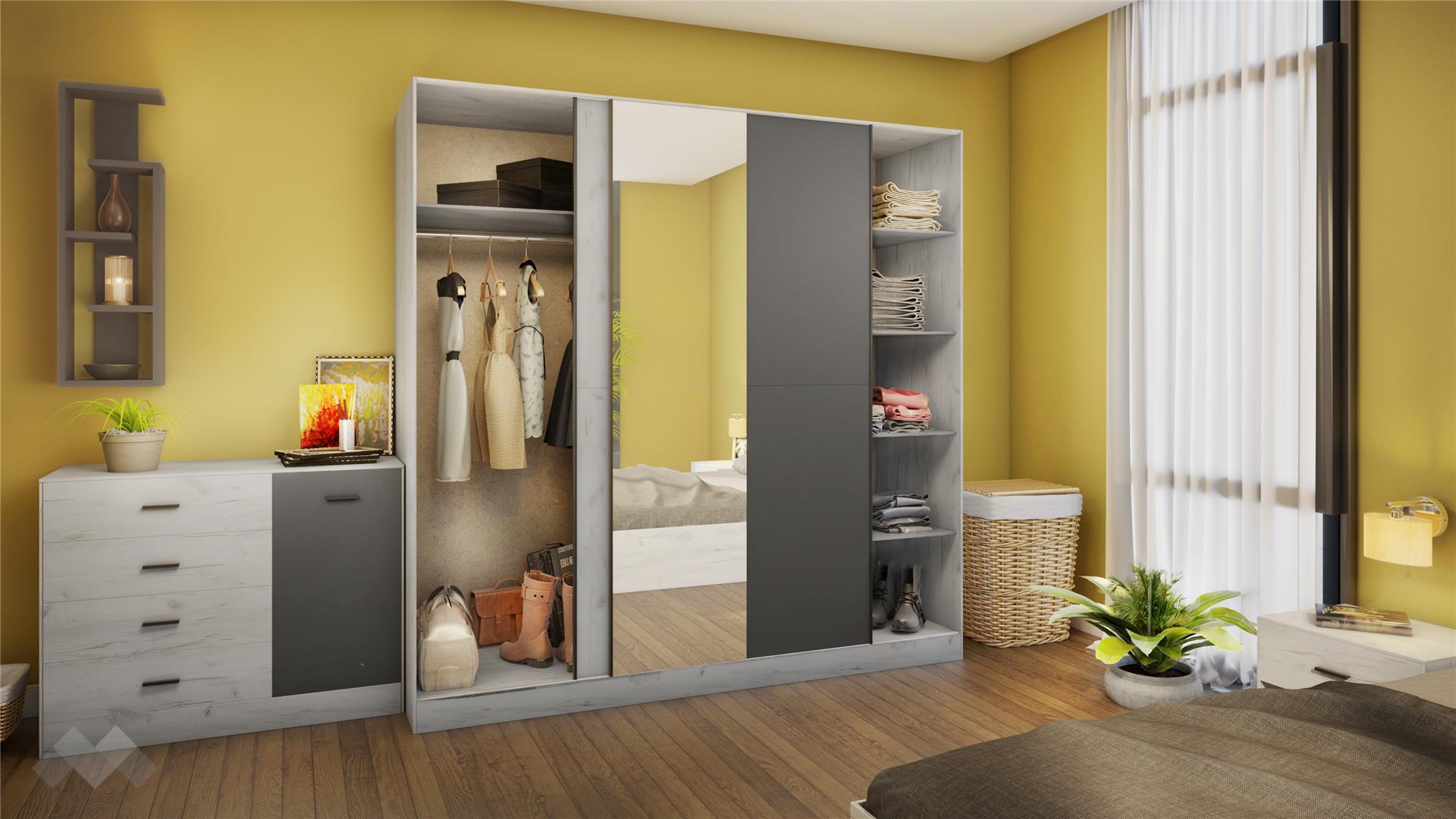 Дамите ще се влюбят в просторния гардероб, впечатляващ отвън и функционално организиран отвътре. Монтираното огледало е идеален помощник при избора на тоалет, а в същото време оптически уголемява стаята. Вътрешното пространство на гардероба е организирано с 5 рафта и лост за закачалки, готови да поберат всичките ти дрехи.