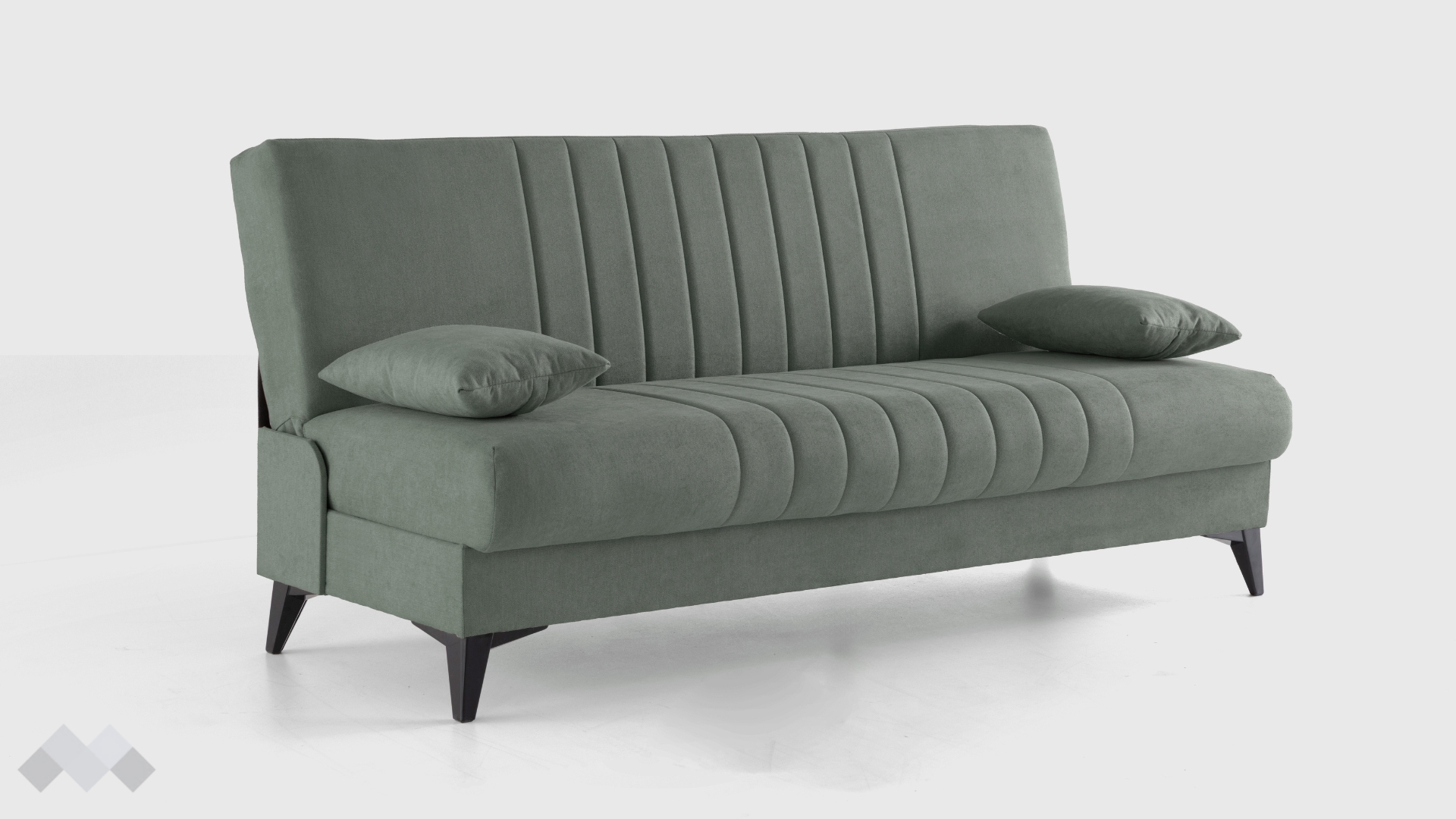 Подлакътниците са оформени с възглавници, които лесно се отстраняват при нужда, за да разширят използваемата площ. Това прави канапето още по-функционално и удобно при посрещане на гости или при необходимост от кратка почивка през деня. Просторната ракла под седалката осигурява допълнително място за съхранение на спално бельо, завивки и други вещи.