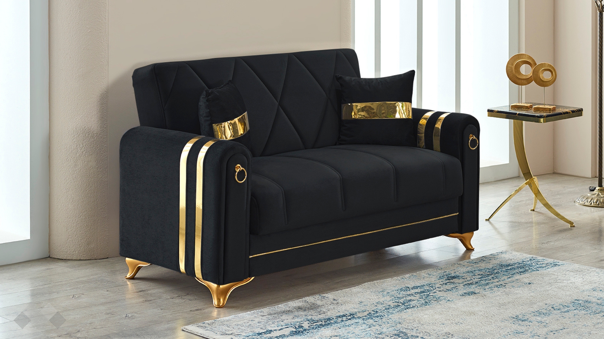 Диван Клара впечатлява с елегантност, изчистени линии и стилна визия. Извитите подлакътници, обкантени вертикално с декоративен кант и крака в златно, в комбинация с фигуралните шевове по дамаската и умело подбрания ѝ цвят, го превръщат в истинско интериорно бижу.