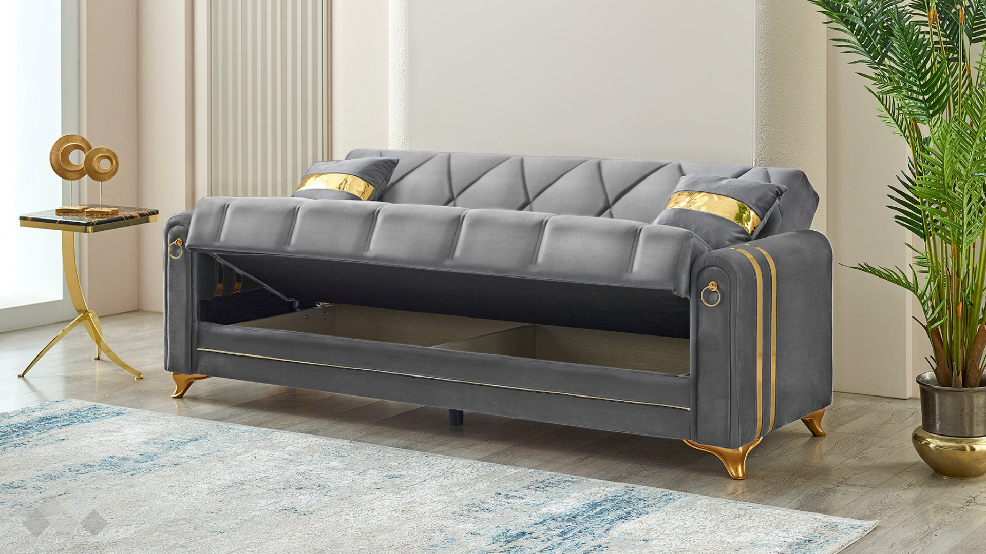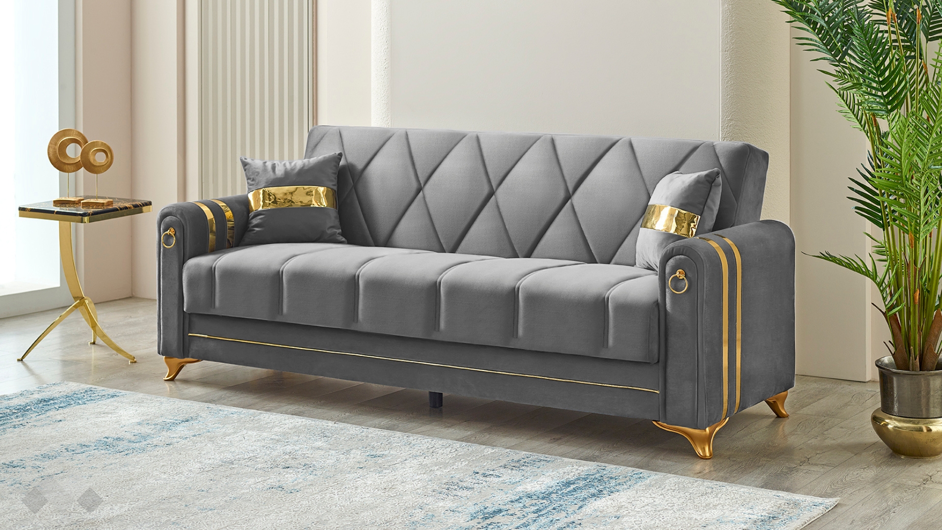 Диван Клара впечатлява с елегантност, изчистени линии и стилна визия. Извитите подлакътници, обкантени вертикално с декоративен кант и крака в златно, в комбинация с фигуралните шевове по дамаската и умело подбрания ѝ цвят, го превръщат в истинско интериорно бижу.