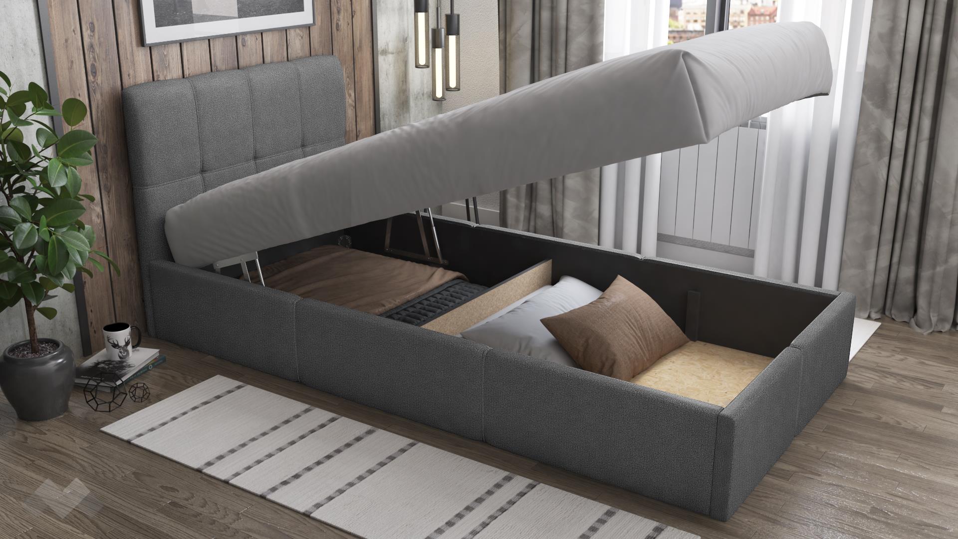 Леглото е с меки форми и елегантен дизайн. Подходящо е за матрак 90/200 см. Под матрака се открива широко пространство, готово да побере всички възглавници и завивки, на които все не намираш място. Така не се налага да закупуваш допълнителни шкафове у дома и пестиш пространство и пари.