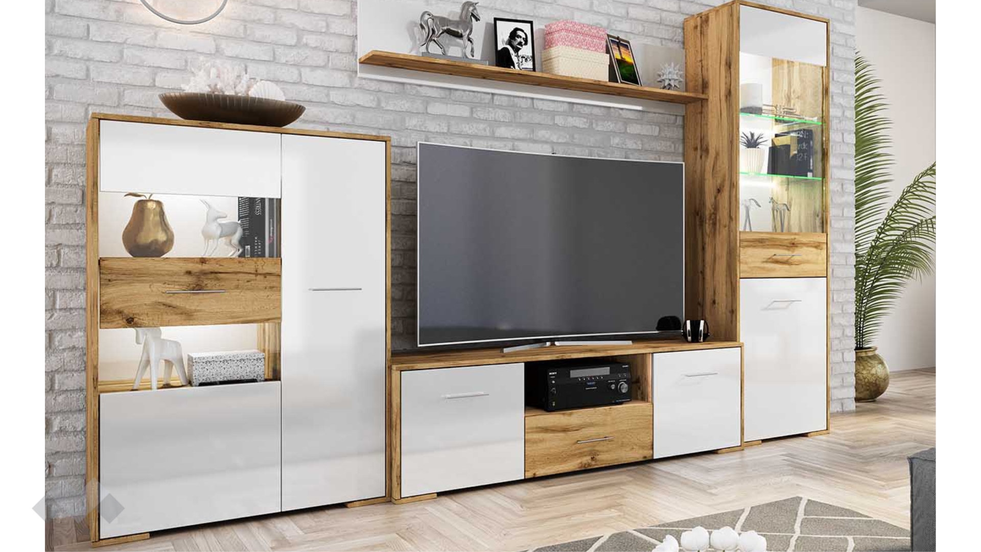 Секцията разполага с висок витринен шкаф – там ще намерят място всичките ти красиви сервизи, любими сувенири или стилни декорации. Допълнителното LED осветление ще акцентира още повече върху секцията и ще я накара да засияе. ТВ шкафът предлага достатъчно пространство, където да поставиш цялата си съпътстваща техника като ТВ приемници, DVD плейъри и други. Можеш да ги организираш, където пожелаеш - в затворено шкафче или отворените ниши. До него се намира още един голям витринен шкаф, в който можеш да прибереш други необходими вещи. Етажерката е прекрасен начин да създадеш допълнително пространство за книги, скъпи спомени като фотографии или сувенири, а може и да аранжираш със стилни декорации и украси – изборът е твой!