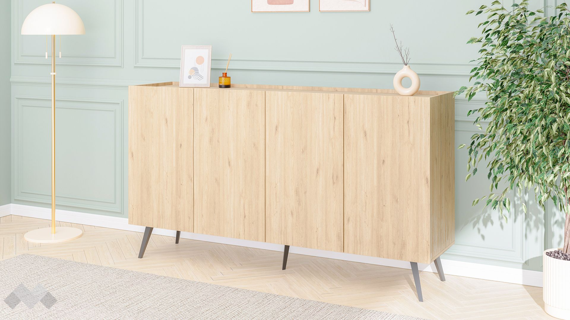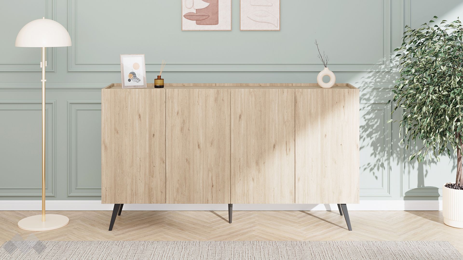Високите крачета придават модерна визия на скрина и ти осигуряват възможност да почистваш лесно пространството под него.