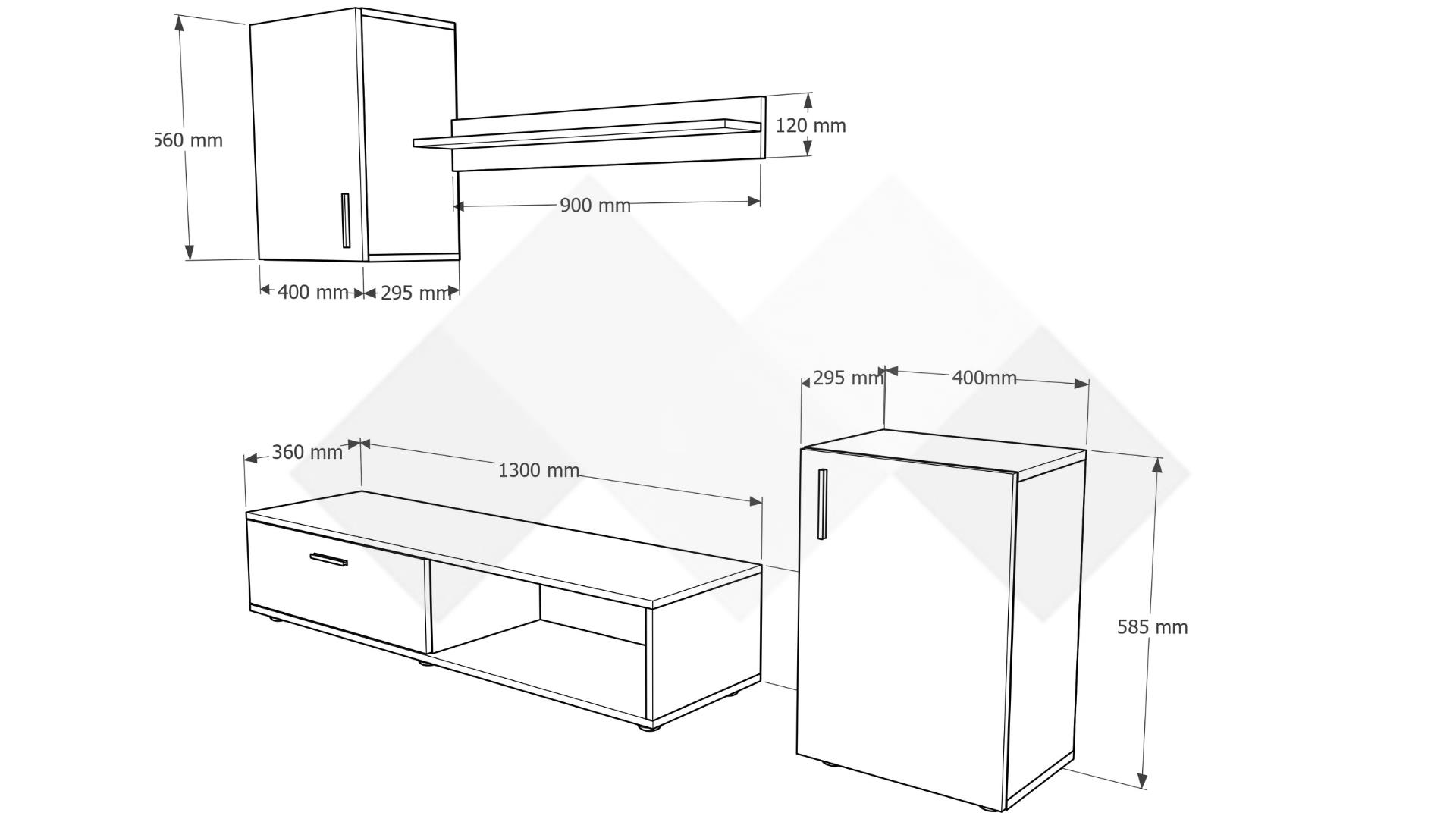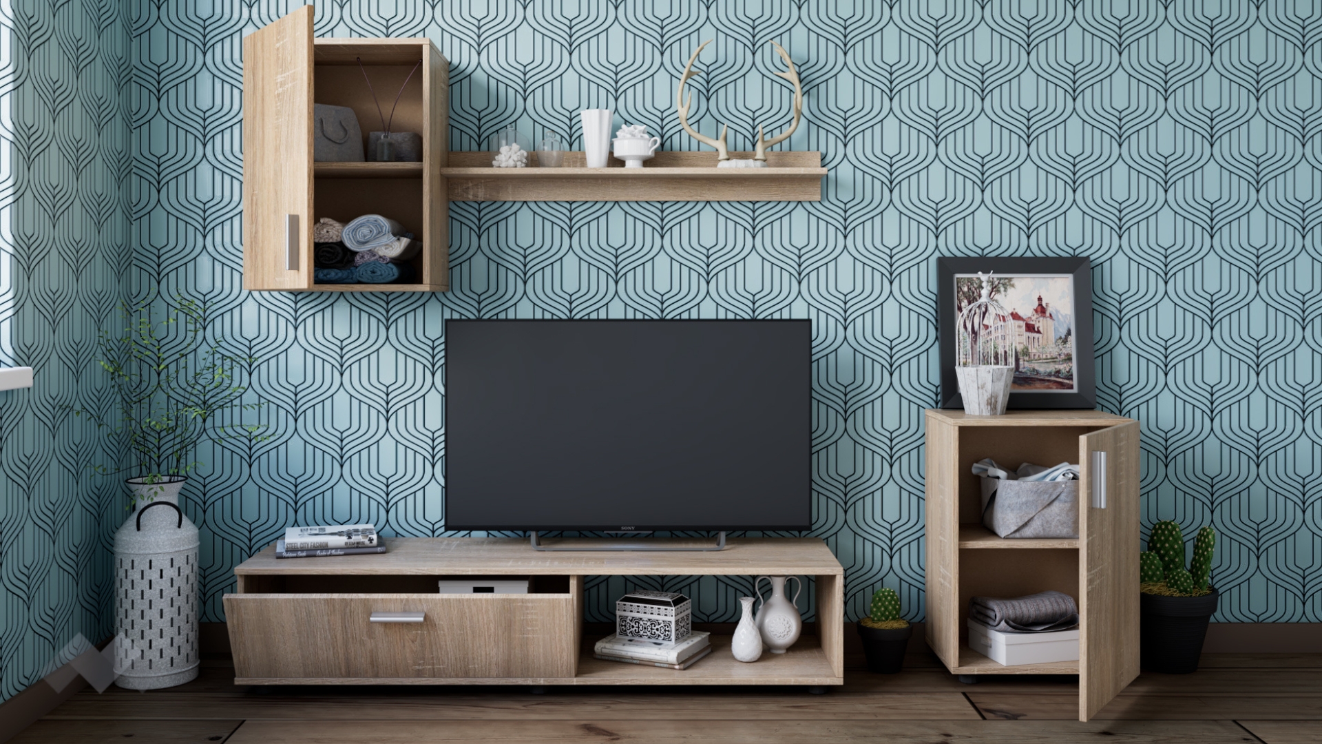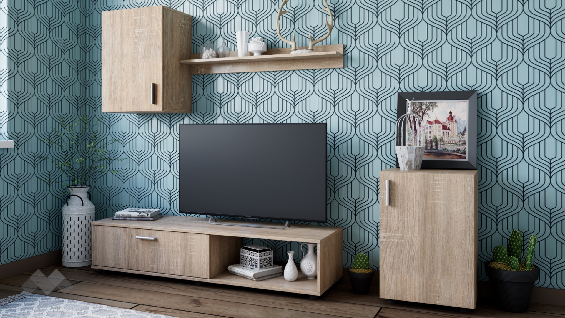 ТВ шкафът се състои от шкаф с падаща врата и отворена ниша, където да поставиш цялата си съпътстваща техника като ТВ приемници, DVD плейъри и други. Високият шкаф ще ти предостави достатъчно място за всички неща, които предпочиташ да останат скрити от погледите, а върху горния плот можеш да подредиш украси по твой вкус. Окаченият шкаф ще приюти всичките ти сервизи, съдове или други вещи, които искаш да ти бъдат винаги под ръка. Етажерката е идеална за подреждане на любимите ти книги, сувенири, фотографии или стилни декорации.