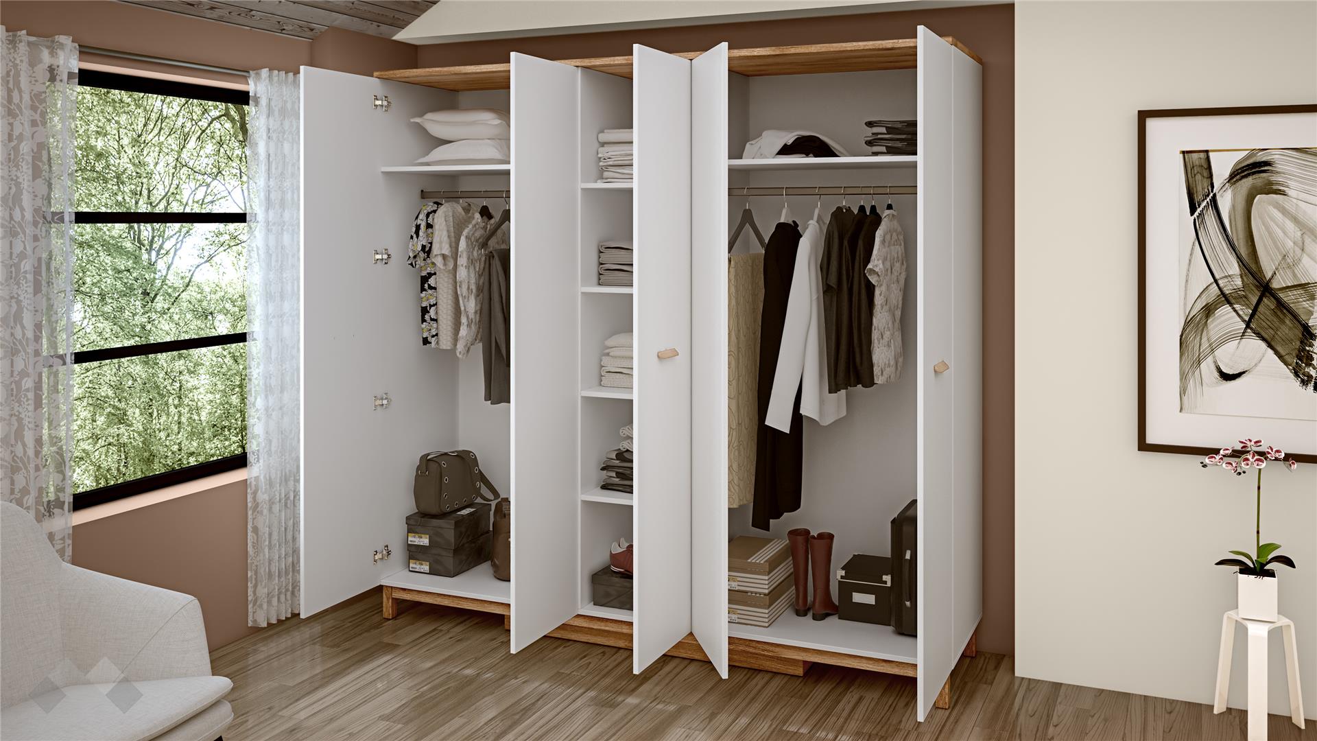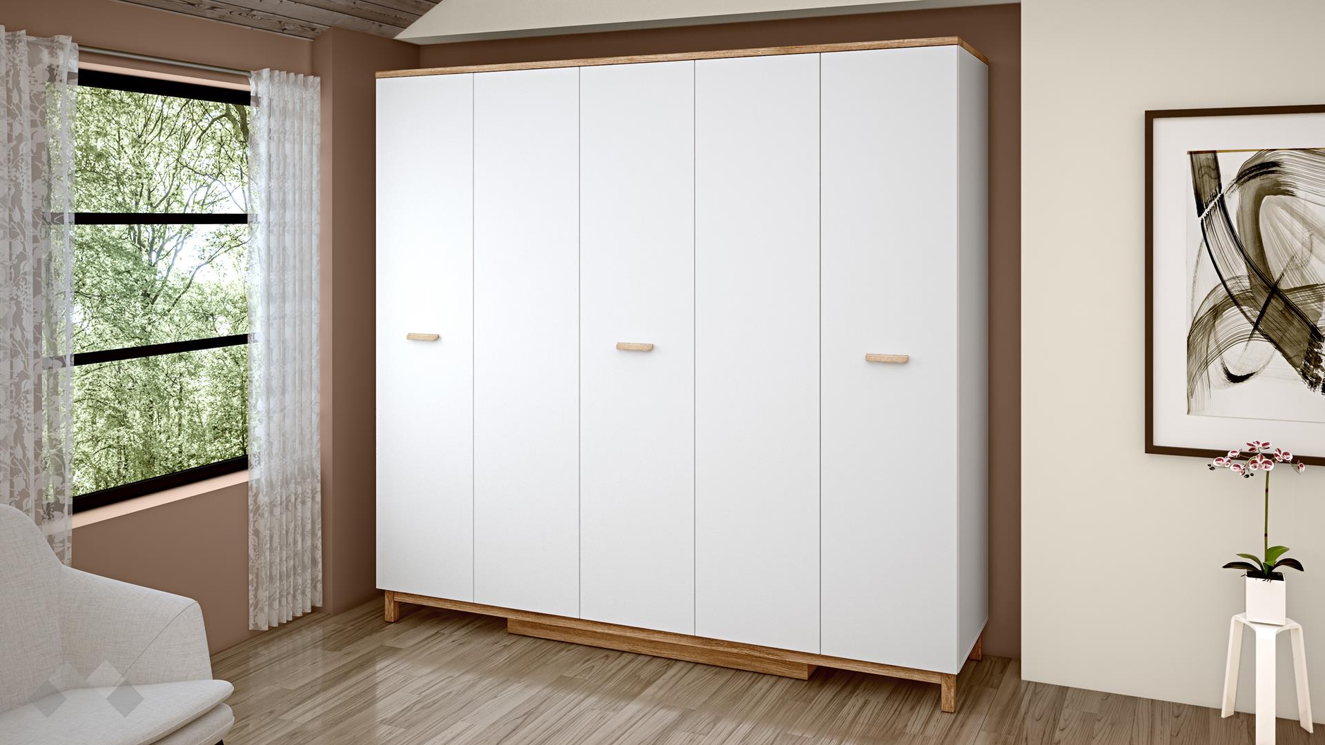 Големият петкрилен гардероб е практичното сърце на комплекта, предлагайки максимален капацитет за съхранение. Гардеробът разполага с пет крила, които осигуряват впечатляващо голям капацитет за съхранение. Това позволява изключително лесно и организирано прибиране на цялото облекло, аксесоари и спално бельо. Зад средната врата ще откриеш 4 рафта, а зад останалите врати се крият лостове за закачалки.