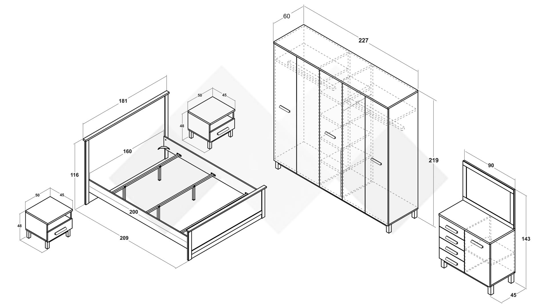 ⭐ Предимства: ✓ 18 мм ПДЧ ✓ спалня с висока табла✓за матрак 160/200 ✓ 2 нощни шкафчета ✓ петкрилен гардероб ✓ скрин с огледало ✓ компактен и практичен ✓ модерен дизайн ✓ качествена изработка