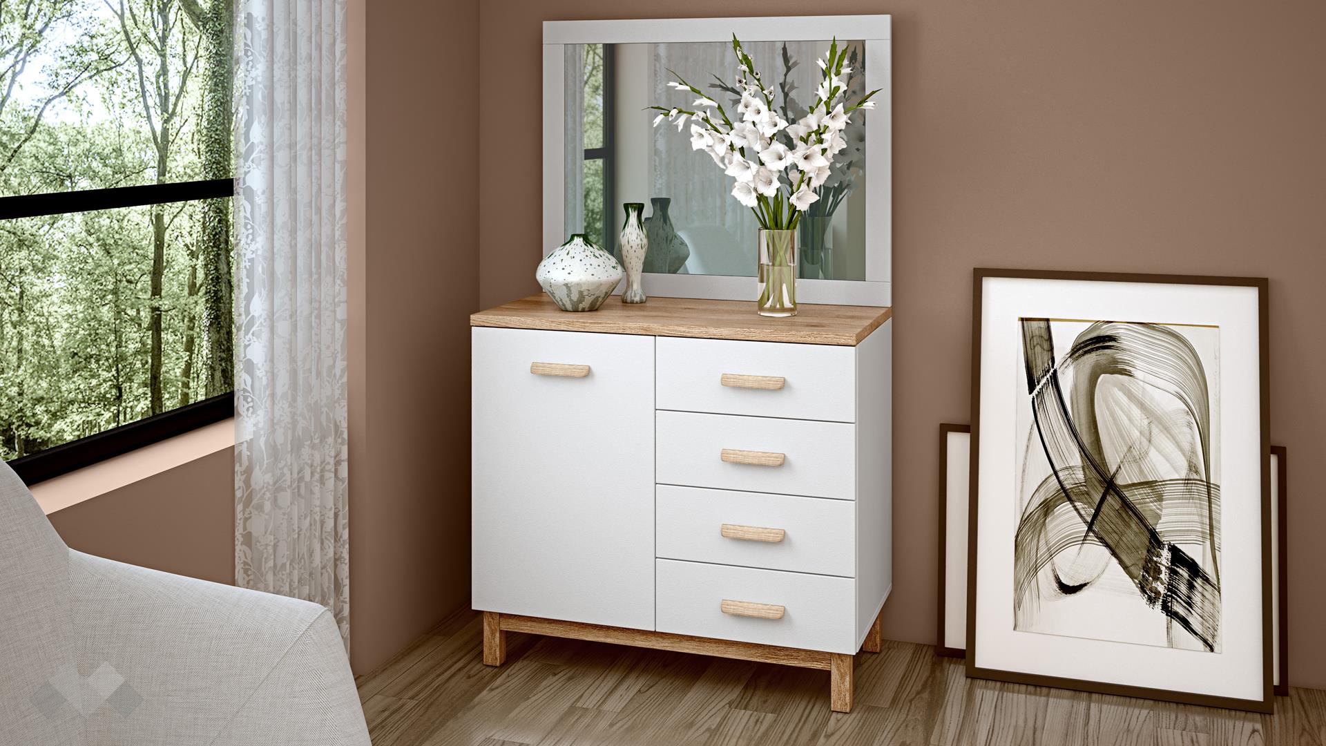 Комплектът включва функционален скрин, който предоставя обилно място за съхранение. Скринът разполага с четири чекмеджета, които осигуряват удобно организиране на дрехи и аксесоари. На скрина е поставено елегантно огледало, което едновременно е практично и допринася за оптическото разширяване на пространството.