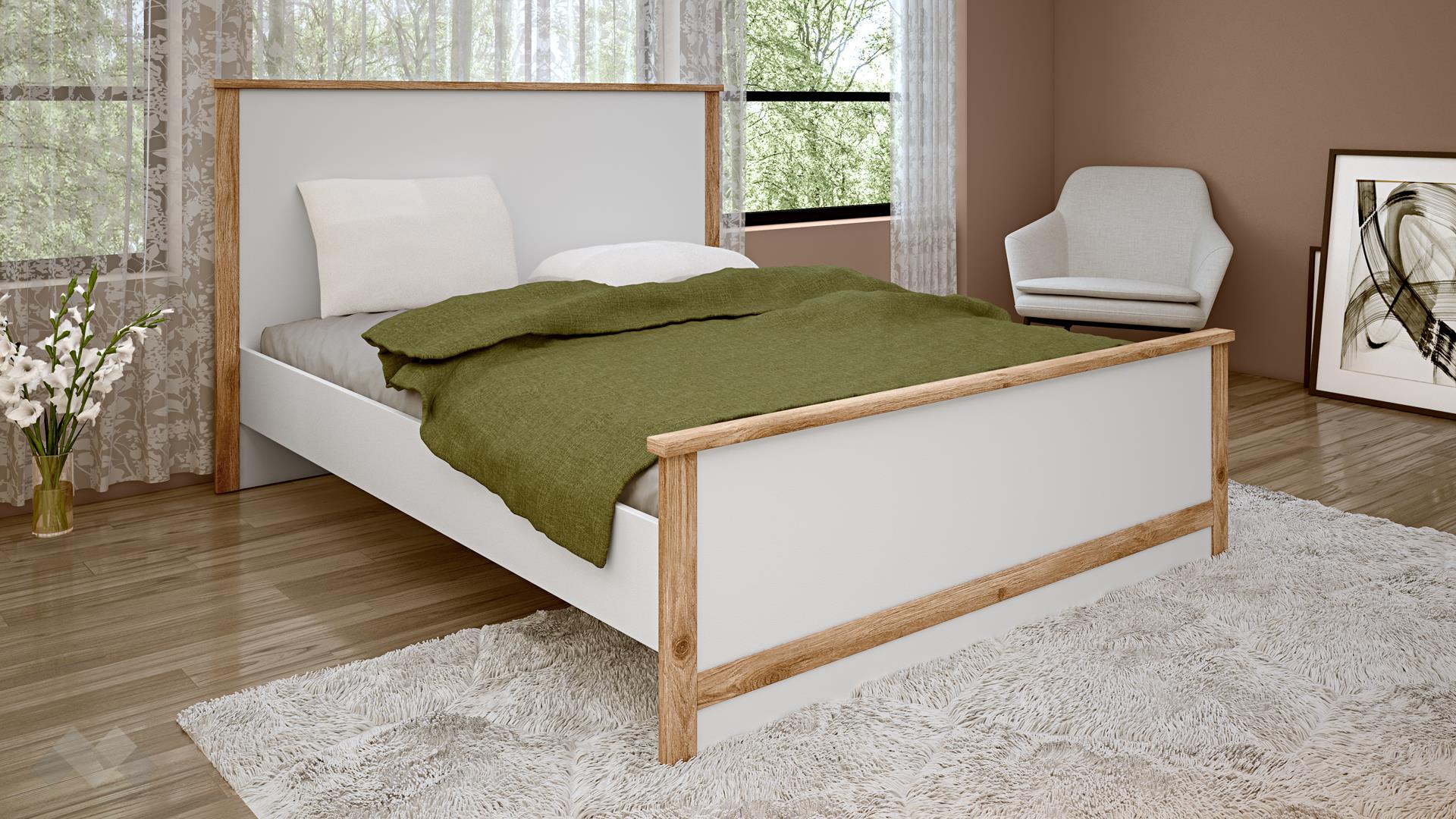 Централният елемент на комплекта е леглото с изцяло бяла основа, която придава лекота и модерно излъчване. Таблата на леглото също е бяла, но е елегантно рамкирана с декор дъб кадис, което добавя топъл, естествен акцент и подчертава линията на леглото. Тази комбинация създава усещане за чистота и естествена красота.