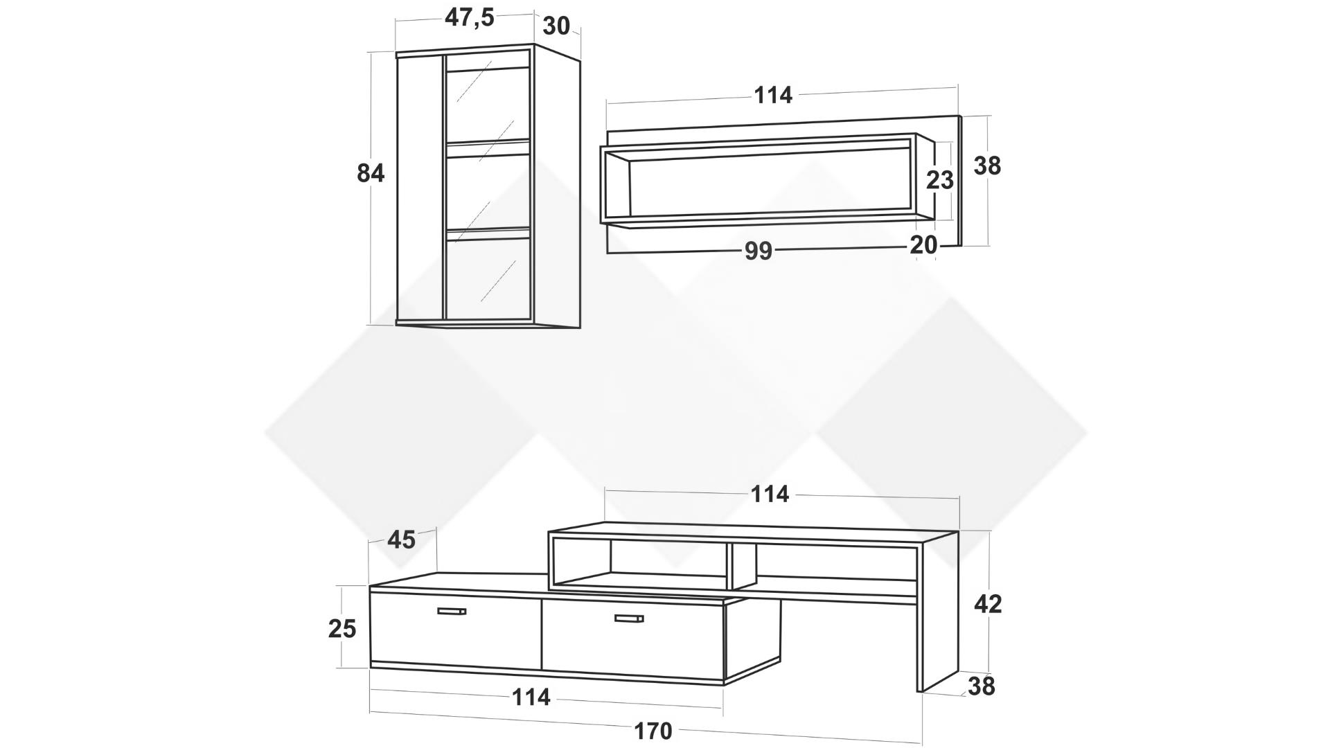 ТВ шкаф: Д: 170 см Ш: 45 см В: 42 см