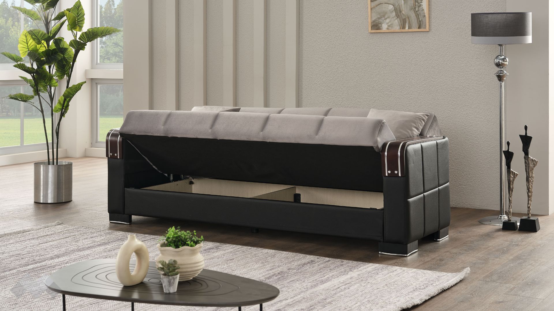 Диван Малатия е и функционален - благодарение на клик-клак механизма ще разполагаш с повече пространство за релакс - 112/190 см, а под седалката се крие удобна ракла, където да съхраняваш завивки, възглавници и други вещи. Дамаската е приятна на допир, изработена от здрав и устойчив текстил, а за още по изтънчена визия, подлакътниците са с покрити с матово-черна еко кожа.