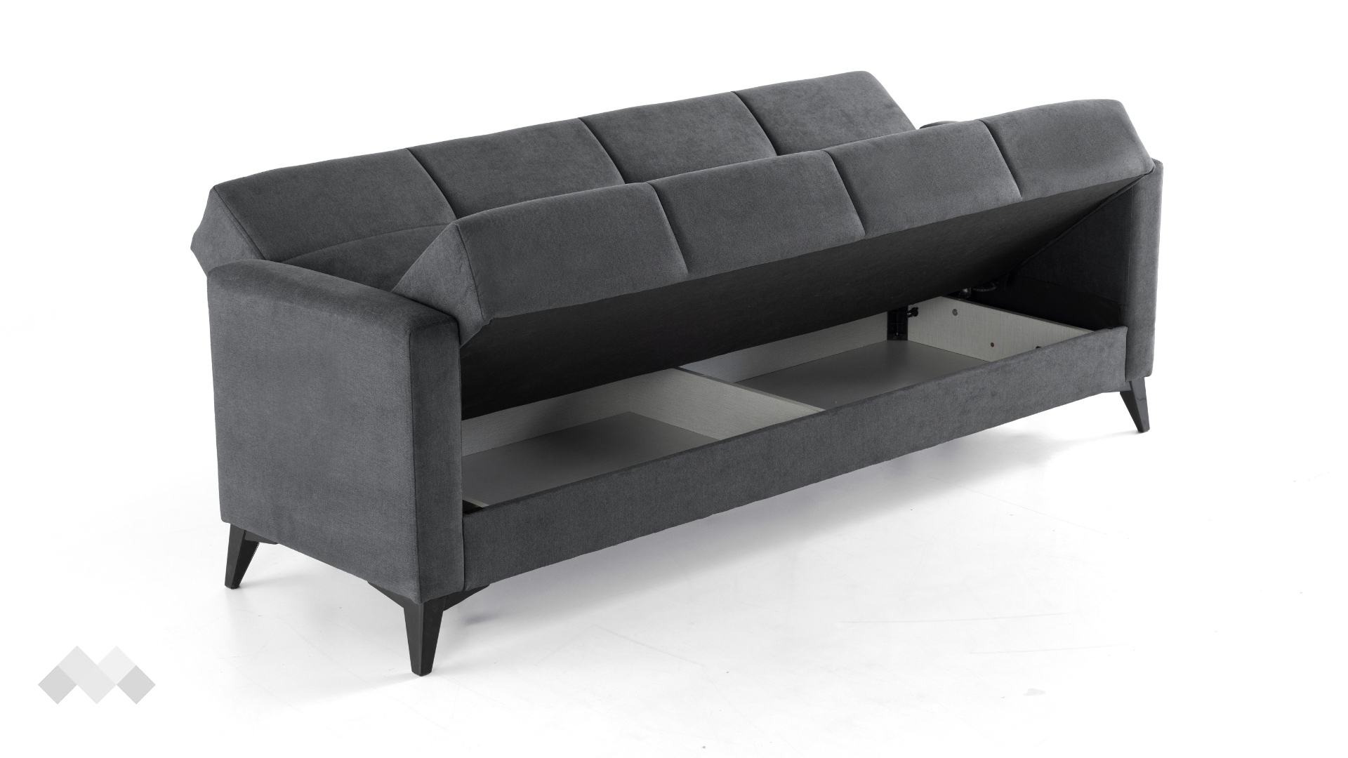 Дизайнът е изчистен и добре структуриран, като подлакътниците са стабилни – осигуряващи надеждна опора при сядане. Под седалката се намира удобна и дълбока ракла, в която можеш да съхраняваш всичко необходимо – спално бельо, възглавници, одеяла или сезонни вещи.