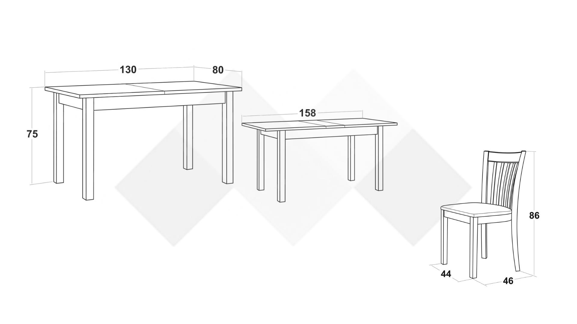 Трапезен комплект Нати L разполага с маса с дължина 130 см и 6 стола. Комплектът е изработен от масивна дървесина. А когато се нуждаеш от повече място, масата се разтяга до 158 см. Столовете са също толкова здрави и стабилни. Седалната част е достатъчно мека, за да ти е комфортно и в същото време удобно за хранене.