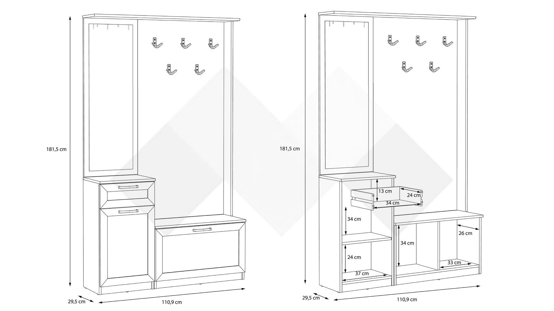 В лявата част на портманто Никайло разполагаш с чекмедже и затворен шкаф, в които можеш да организираш необходимите за ежедневието вещи, които да ти бъдат под ръка преди да излезеш. Плотът отгоре е чудесно място за подреждане на допълнителни аксесоари или декорации.