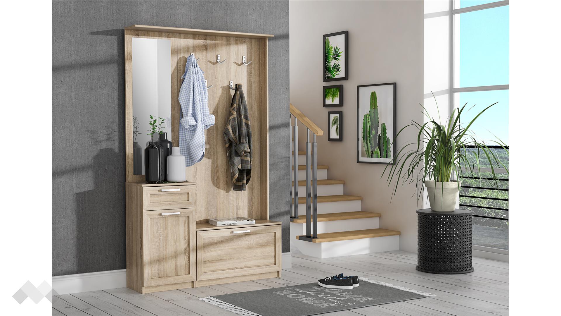 Шкафът в основата на портмантото е идеален за съхранение на обувки. Горният му плот може да използваш като място, където да поставиш чантите си, когато се прибираш.